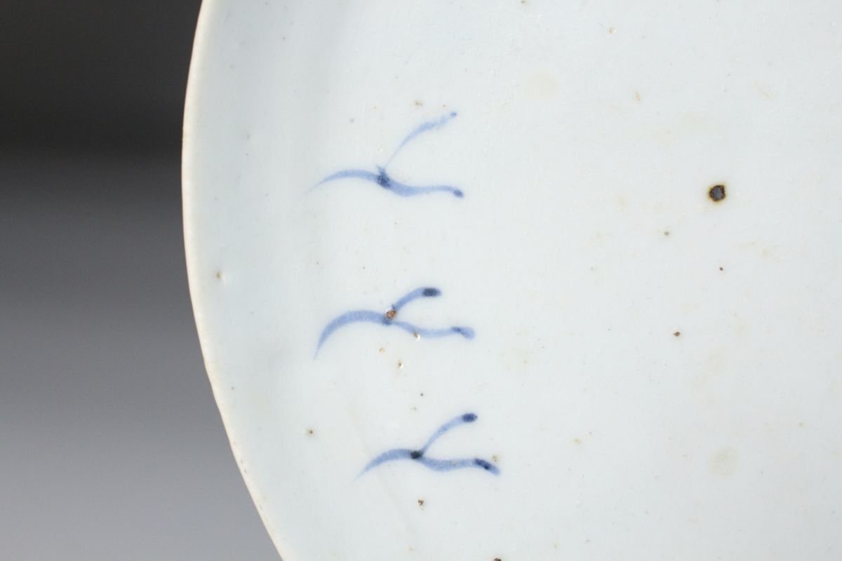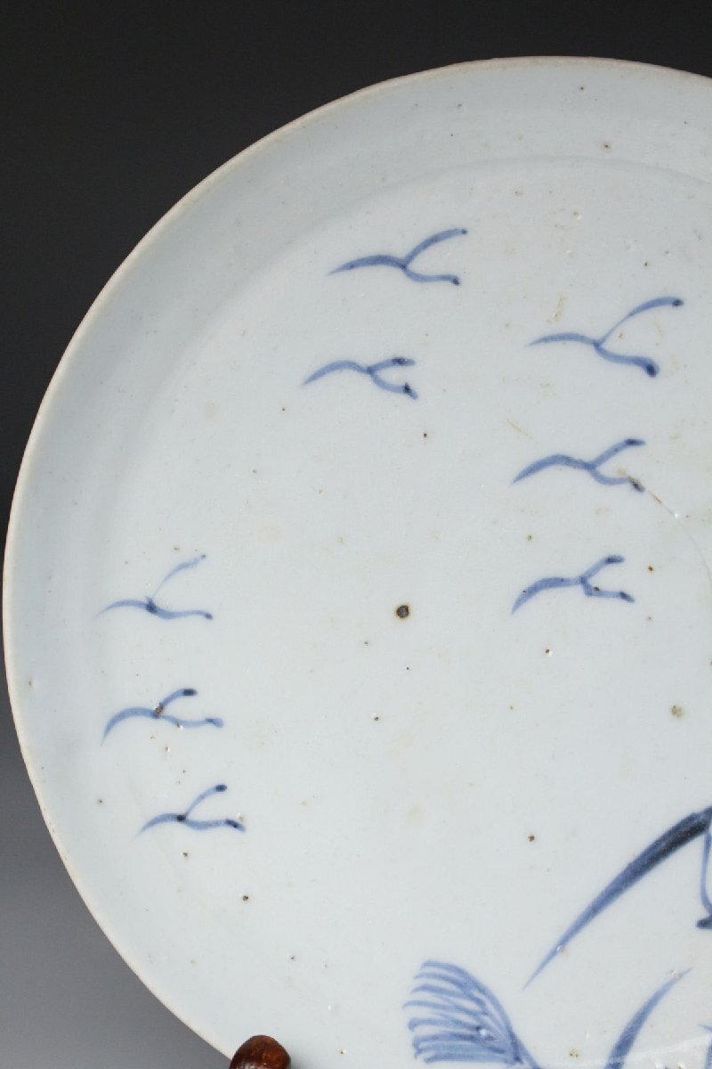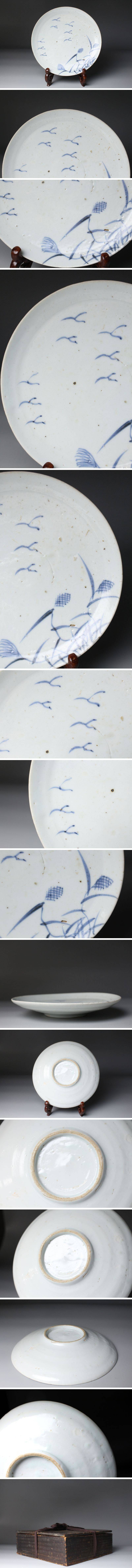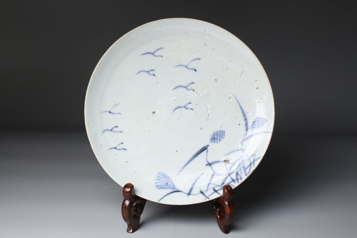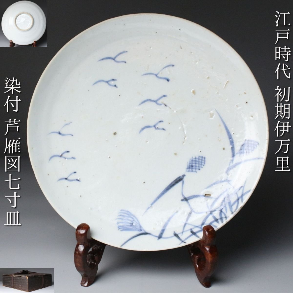 [.TI]25.10 25102223A* * * 商品詳細 * * * ここでしか出逢うことのできない唯一の美をご紹介させて頂きます。 こちらは、江戸時代初期に焼成された初期伊万里の染付「芦雁図七寸皿」でございます。 その静謐な佇まいの中に、初期伊万里ならではの素朴な趣と、初期磁器の息づかいが見て取れます。 淡い呉須の筆致により、秋草の間を飛ぶ雁の姿が簡潔ながらも詩情豊かに描かれ、余白の美が際立つ構図となっております。 この時期特有の白磁の肌には、ほんのりとした白色の釉調が見られ、時代の窯変や鉄釉の景色が自然な風情を添えています。 高台の作りや釉の流れにも、まさに“時代本歌”たる風格が漂い、現代の再現品では決して表せぬ静かな格調を感じさせます。 飾皿として床の間や茶室に据えれば、四季折々の空気を柔らかく映し出し、見る者の心に安らぎを与えるでしょう。 日本陶磁史の初源を物語る、品格と詩情を兼ね備えた一枚です。 ■商品内容/ 皿、箱 ■サイズ/横18.5㎝×高3㎝ 箱:四方13.5㎝×高7.5㎝ ■状態/ 経年によるスレ、小傷、汚れ 箱にスレ、傷、汚れ、蓋に曲がりがございます。 ※写真にてご確認、ご了承の上ご入札下さい。