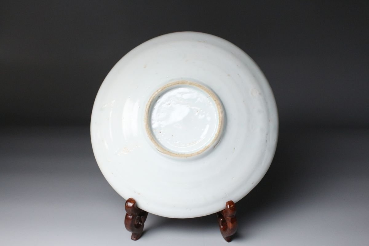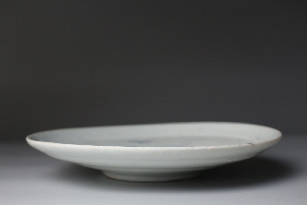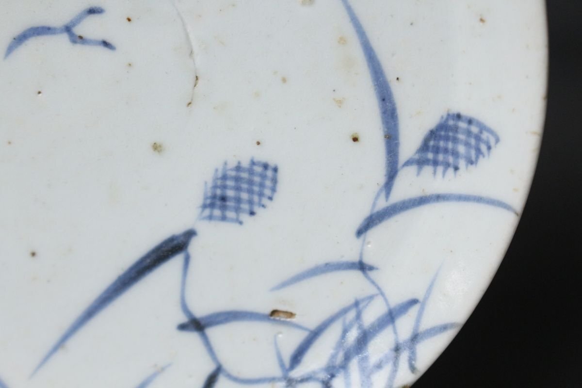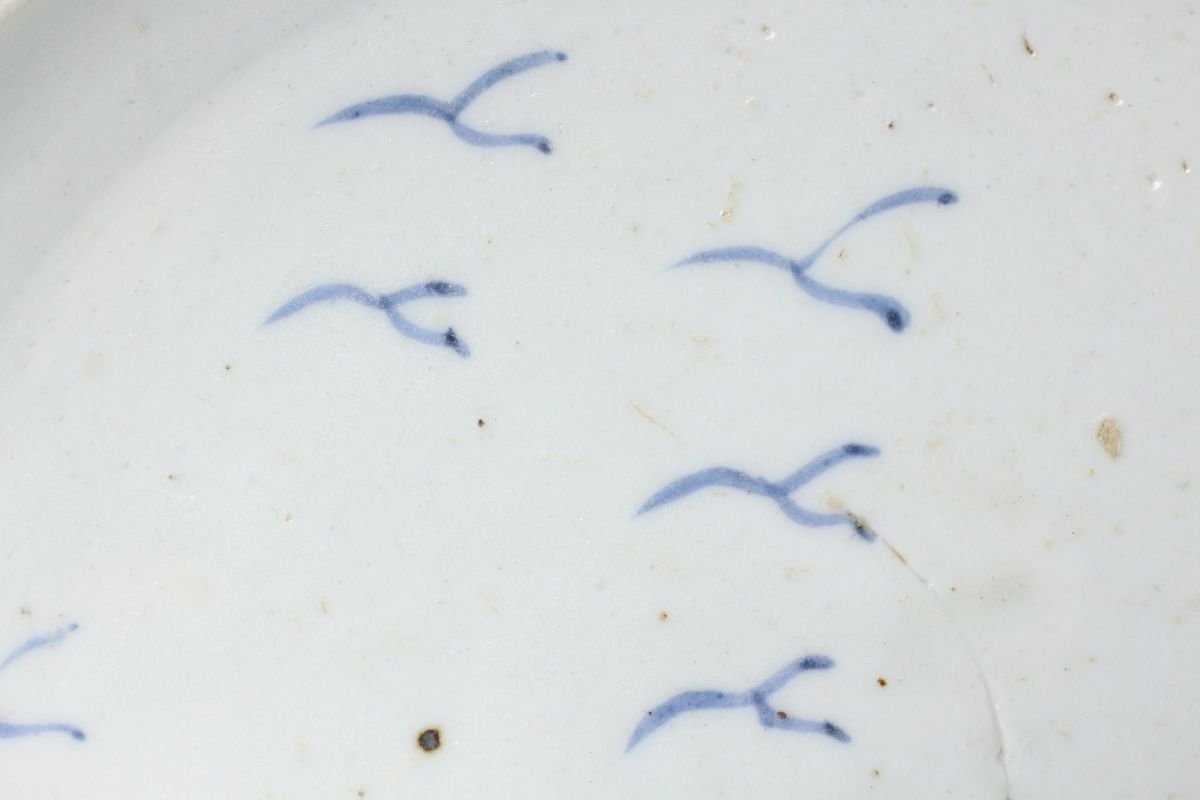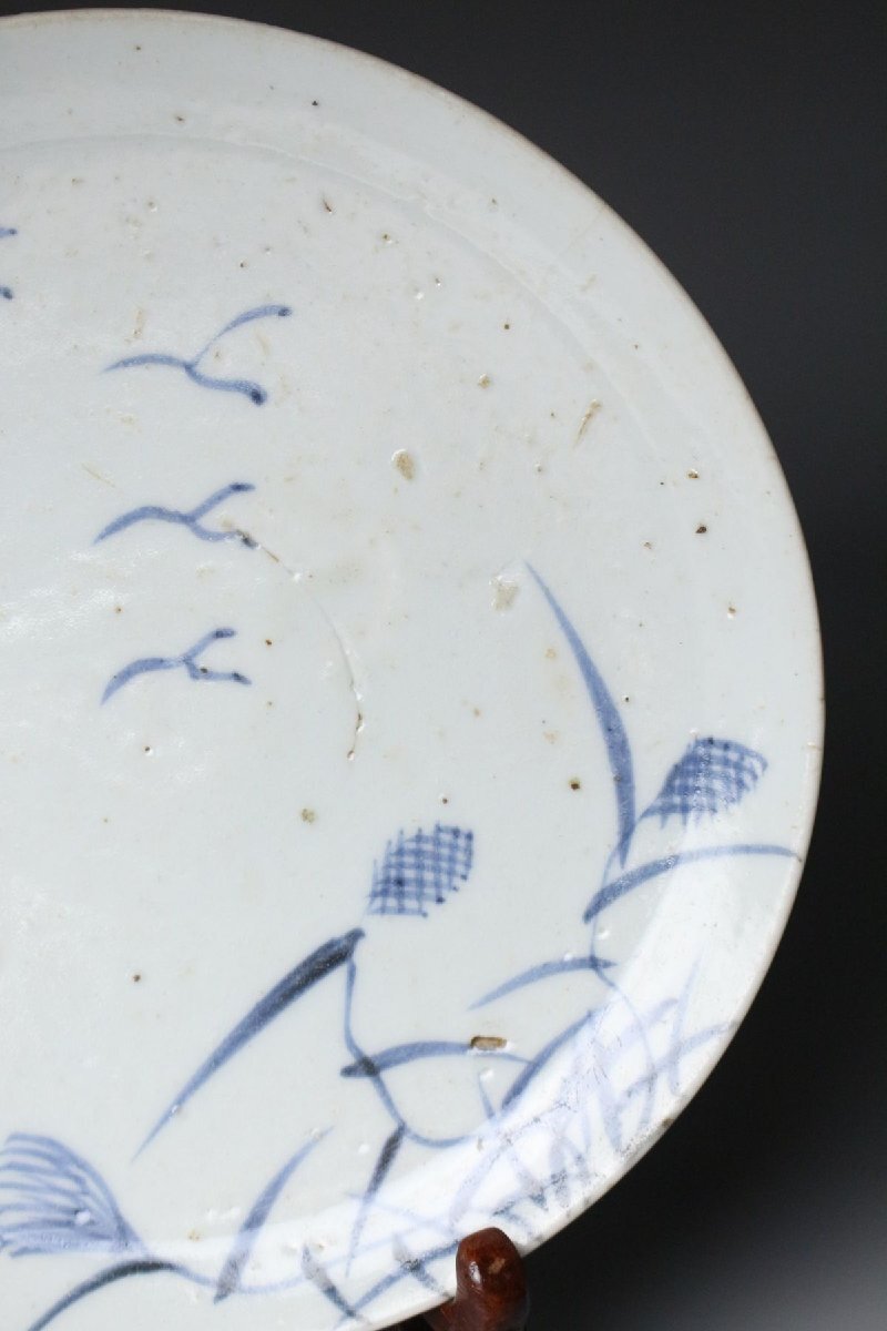 [.TI]25.10 25102223A* * * 商品詳細 * * * ここでしか出逢うことのできない唯一の美をご紹介させて頂きます。 こちらは、江戸時代初期に焼成された初期伊万里の染付「芦雁図七寸皿」でございます。 その静謐な佇まいの中に、初期伊万里ならではの素朴な趣と、初期磁器の息づかいが見て取れます。 淡い呉須の筆致により、秋草の間を飛ぶ雁の姿が簡潔ながらも詩情豊かに描かれ、余白の美が際立つ構図となっております。 この時期特有の白磁の肌には、ほんのりとした白色の釉調が見られ、時代の窯変や鉄釉の景色が自然な風情を添えています。 高台の作りや釉の流れにも、まさに“時代本歌”たる風格が漂い、現代の再現品では決して表せぬ静かな格調を感じさせます。 飾皿として床の間や茶室に据えれば、四季折々の空気を柔らかく映し出し、見る者の心に安らぎを与えるでしょう。 日本陶磁史の初源を物語る、品格と詩情を兼ね備えた一枚です。 ■商品内容/ 皿、箱 ■サイズ/横18.5㎝×高3㎝ 箱:四方13.5㎝×高7.5㎝ ■状態/ 経年によるスレ、小傷、汚れ 箱にスレ、傷、汚れ、蓋に曲がりがございます。 ※写真にてご確認、ご了承の上ご入札下さい。