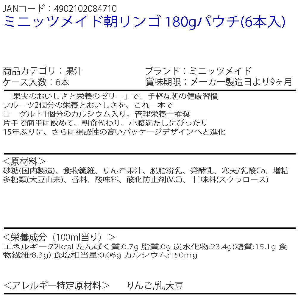 | 商品名 | ミニッツメイド朝リンゴ 180gパウチ(6本入) | |