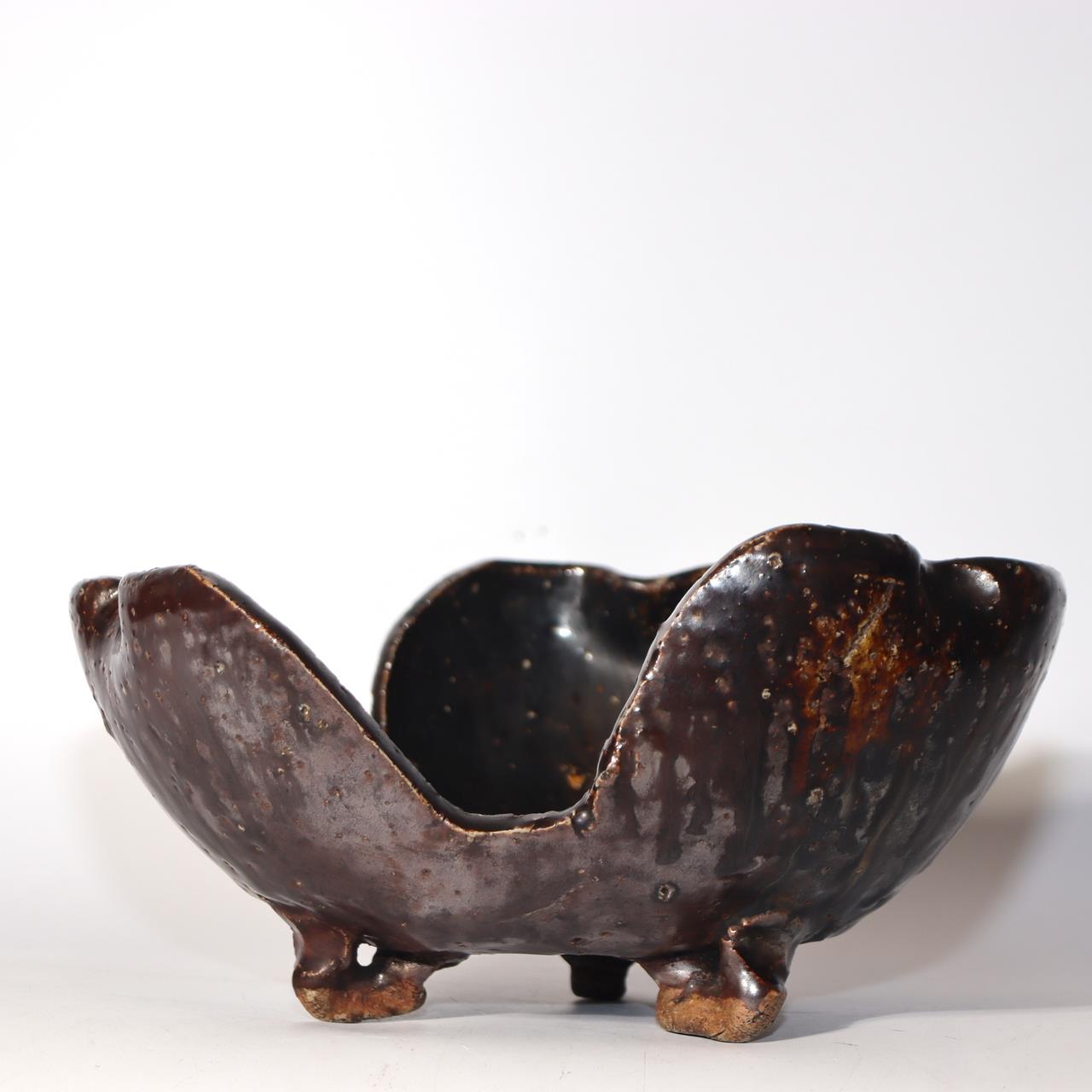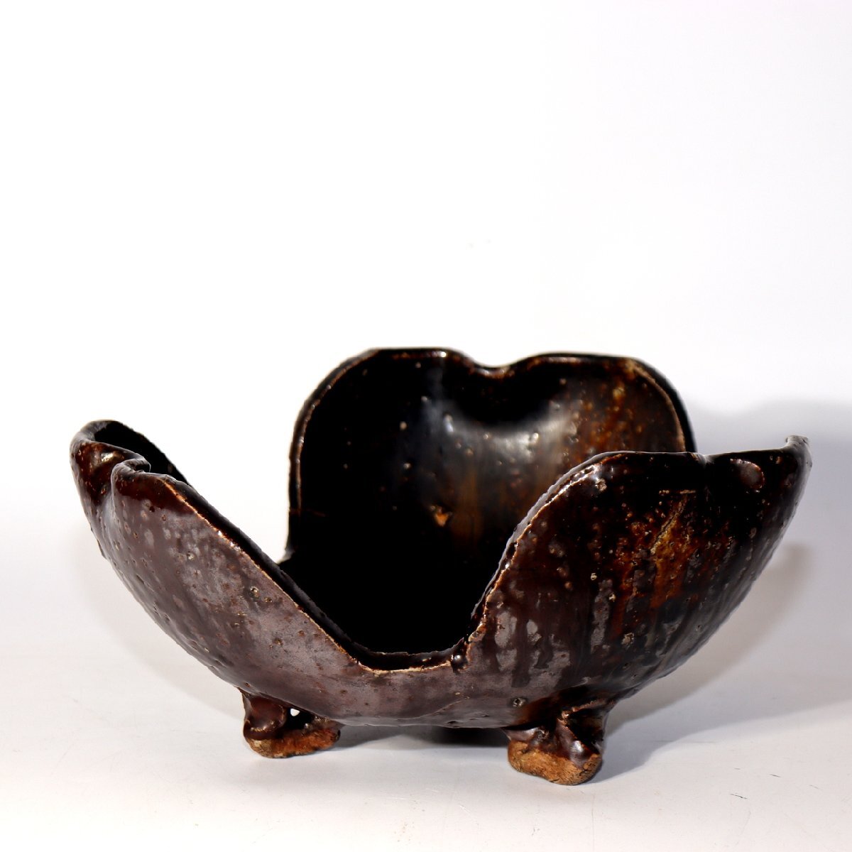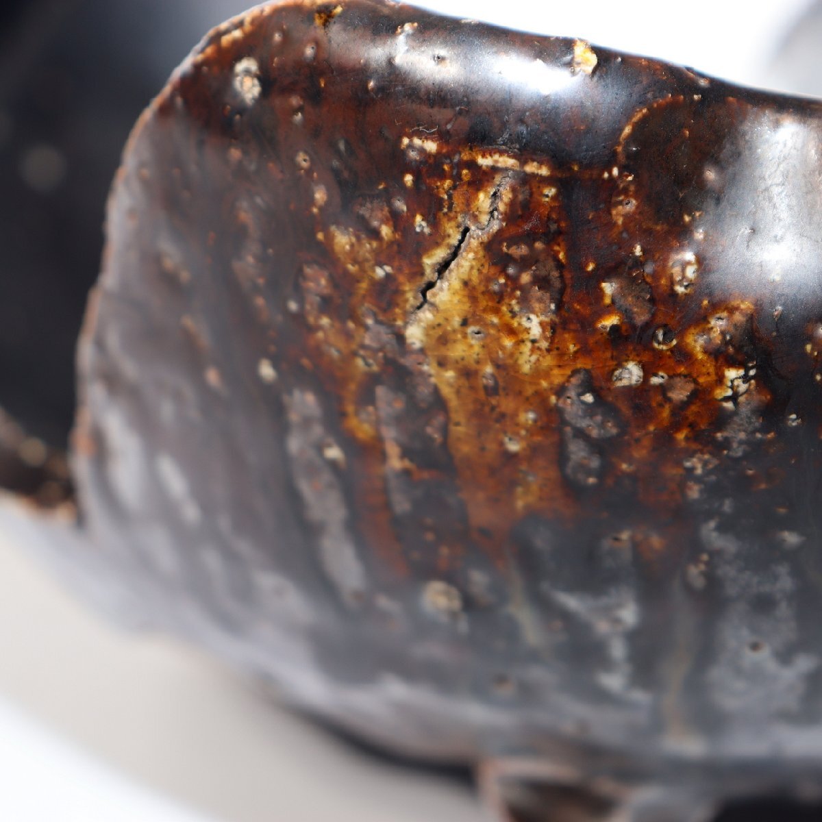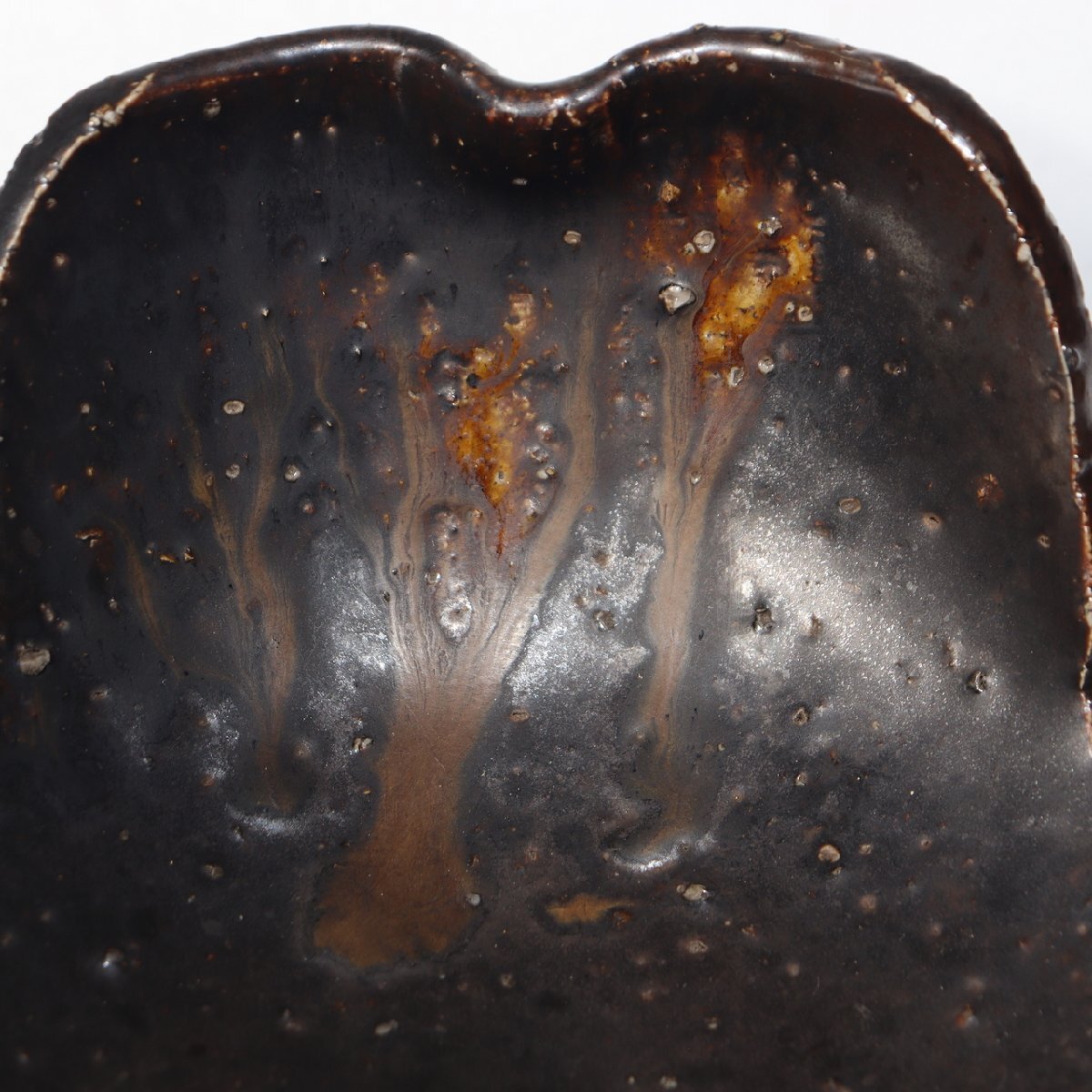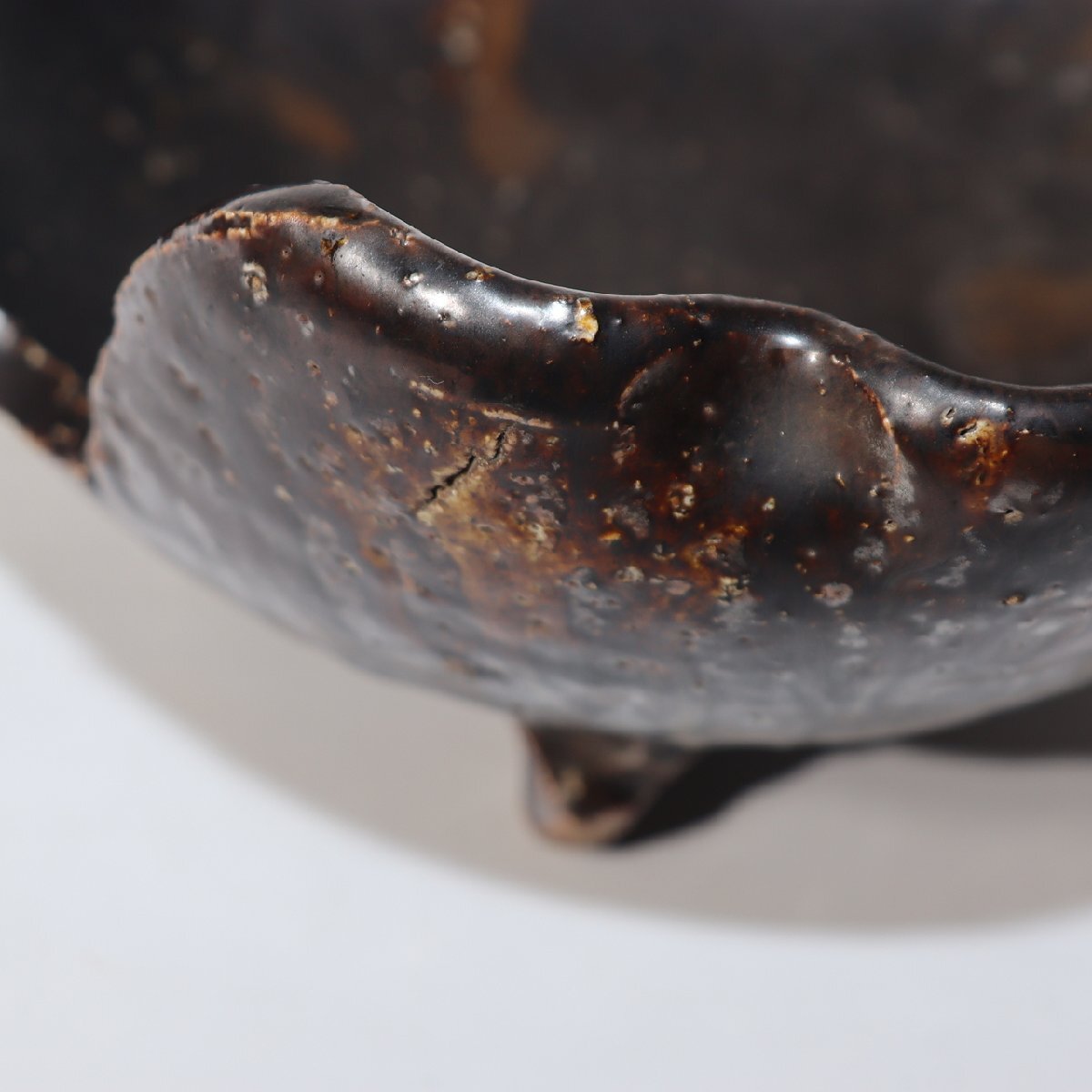 桃山時代末期から江戸初期にかけて焼成されたと見られる、 古唐津(黒唐津)の「割山椒(わりざんしょう)」向付です。 特筆すべきは、一般的な向付の規格を超えた「大きさ」です。 通常、掌に収まるサイズが多い割山椒ですが、本品は幅約18cmという堂々たるサイズを誇ります。 信頼ある目利きの収集家より、桃山期の茶陶として譲り受けた一品です。 熟してパカリと割れた山椒の実。 大胆な造形には、古田織部も愛したあえて形を崩す「破調の美」が息づいています。 鉄分を多く含んだ荒々しい土味、とろりと掛かった黒飴釉の景色です。 現代の写しには出せない、数百年を経たもの特有の枯れた土肌(カセ)と、 釉薬の縮れや溜まりが、圧倒的な時代感を放っています。 【サイズ】 高さ:約9cm 幅:約18×17.5cm 重量:約645g 【状態】 目立つヒビやカケはなく、この時代のものとしては非常に良好な状態です。 経年によるスレ、釉薬の自然な変化は古陶磁の味わいとしてご理解ください。 詳細は写真をご確認ください。 ![]() ![]() ![]() ![]() ![]() ![]() ◆ 商品について
