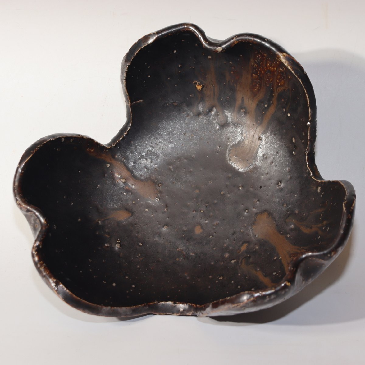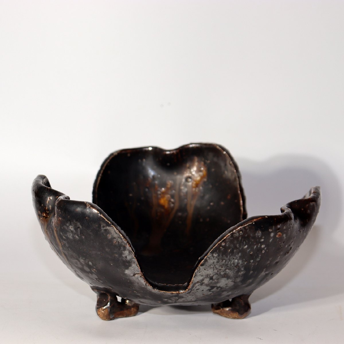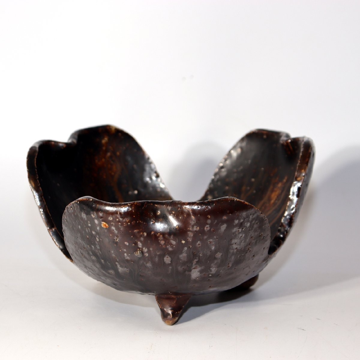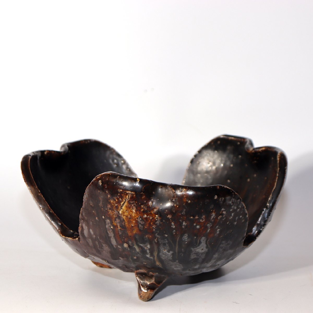 桃山時代末期から江戸初期にかけて焼成されたと見られる、 古唐津(黒唐津)の「割山椒(わりざんしょう)」向付です。 特筆すべきは、一般的な向付の規格を超えた「大きさ」です。 通常、掌に収まるサイズが多い割山椒ですが、本品は幅約18cmという堂々たるサイズを誇ります。 信頼ある目利きの収集家より、桃山期の茶陶として譲り受けた一品です。 熟してパカリと割れた山椒の実。 大胆な造形には、古田織部も愛したあえて形を崩す「破調の美」が息づいています。 鉄分を多く含んだ荒々しい土味、とろりと掛かった黒飴釉の景色です。 現代の写しには出せない、数百年を経たもの特有の枯れた土肌(カセ)と、 釉薬の縮れや溜まりが、圧倒的な時代感を放っています。 【サイズ】 高さ:約9cm 幅:約18×17.5cm 重量:約645g 【状態】 目立つヒビやカケはなく、この時代のものとしては非常に良好な状態です。 経年によるスレ、釉薬の自然な変化は古陶磁の味わいとしてご理解ください。 詳細は写真をご確認ください。 ![]() ![]() ![]() ![]() ![]() ![]() ◆ 商品について