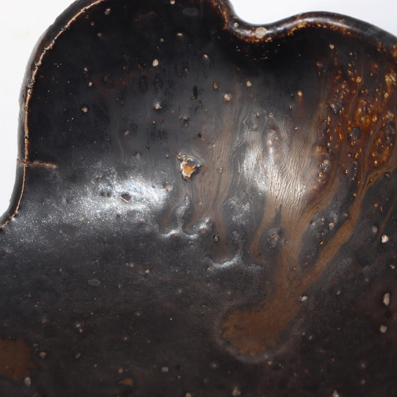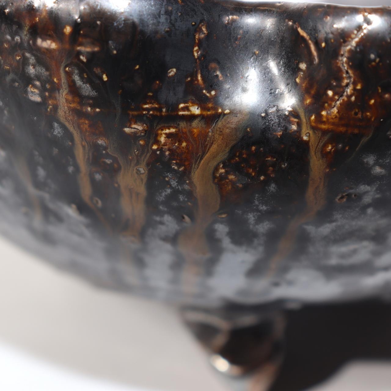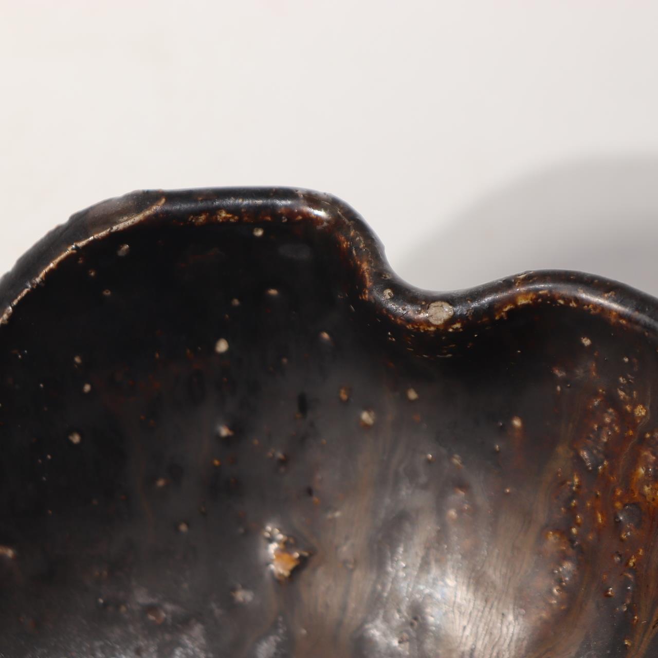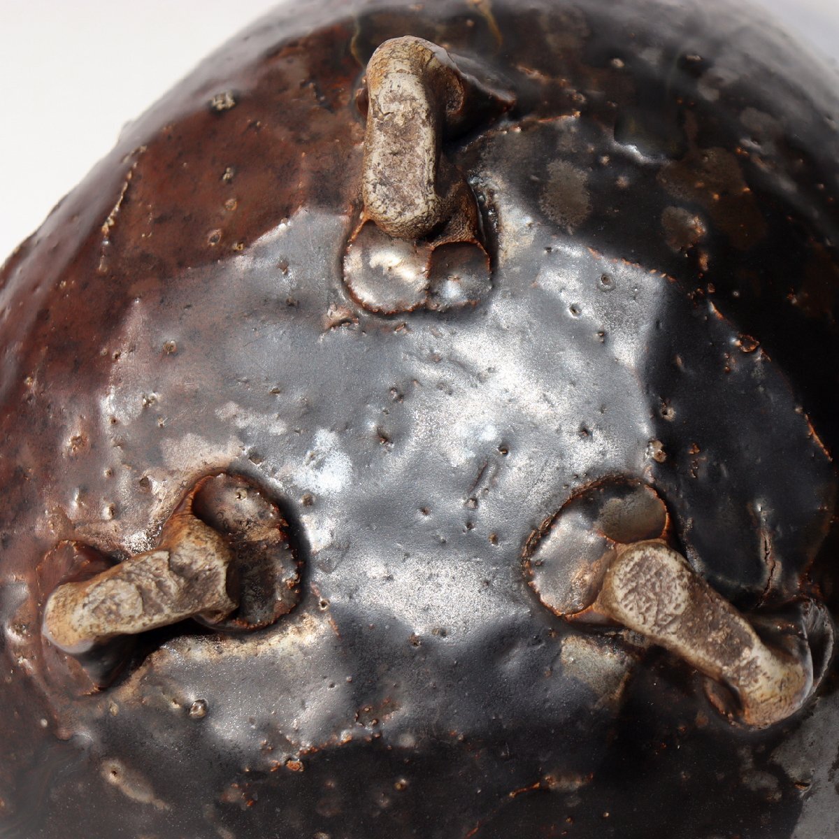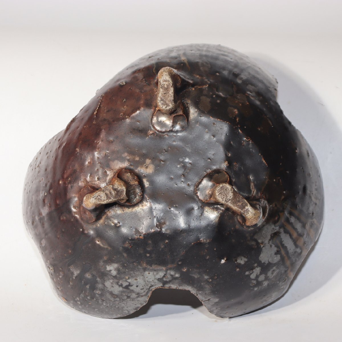 桃山時代末期から江戸初期にかけて焼成されたと見られる、 古唐津(黒唐津)の「割山椒(わりざんしょう)」向付です。 特筆すべきは、一般的な向付の規格を超えた「大きさ」です。 通常、掌に収まるサイズが多い割山椒ですが、本品は幅約18cmという堂々たるサイズを誇ります。 信頼ある目利きの収集家より、桃山期の茶陶として譲り受けた一品です。 熟してパカリと割れた山椒の実。 大胆な造形には、古田織部も愛したあえて形を崩す「破調の美」が息づいています。 鉄分を多く含んだ荒々しい土味、とろりと掛かった黒飴釉の景色です。 現代の写しには出せない、数百年を経たもの特有の枯れた土肌(カセ)と、 釉薬の縮れや溜まりが、圧倒的な時代感を放っています。 【サイズ】 高さ:約9cm 幅:約18×17.5cm 重量:約645g 【状態】 目立つヒビやカケはなく、この時代のものとしては非常に良好な状態です。 経年によるスレ、釉薬の自然な変化は古陶磁の味わいとしてご理解ください。 詳細は写真をご確認ください。 ![]() ![]() ![]() ![]() ![]() ![]() ◆ 商品について