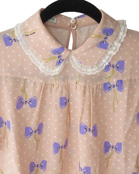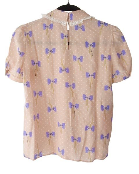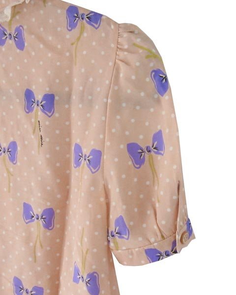 | フレアーデザインのフェミニンなブラウス。リボン柄の甘目デザイン。ブランドロゴがところどころ入っていて、さりげないブランドアピールがあります。 |