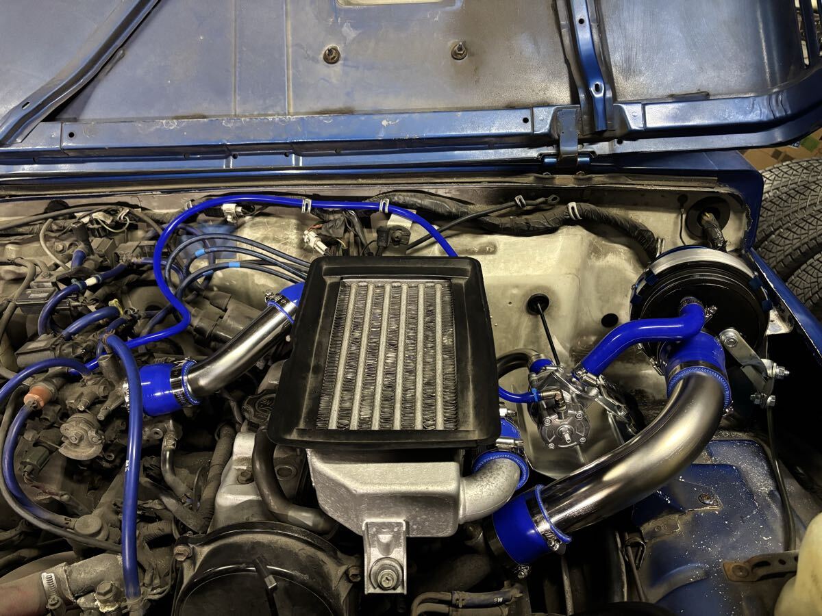 ● 次は始めにターボパイプとエルボターボホースの交換から始めていきます。純正ホースと交換するだけですがインタークーラーは必ず外して作業を行いください!インタークーラーを固定のままホースをずらすなどの作業は厳禁です!手前の10ミリボルトと両端のボルトを外したらインタークーラーは外れますからターボパイプをインタークーラー側から差し込みスロボ側へ差し込む順番で取付け次にエルボホースを取り付けます。交換後の締め付けバンドは圧縮漏れを防ぐ為にも必ずある程度強く締め付けるようお願いします。次はブローオフのバイパスホースをEG側インテークに差し込みステーをテーブル中央小穴2個のうち奥側を利用し固定してください。遮熱板も同様にテーブル手前の2ホールを利用しボルトにて取り付けします。