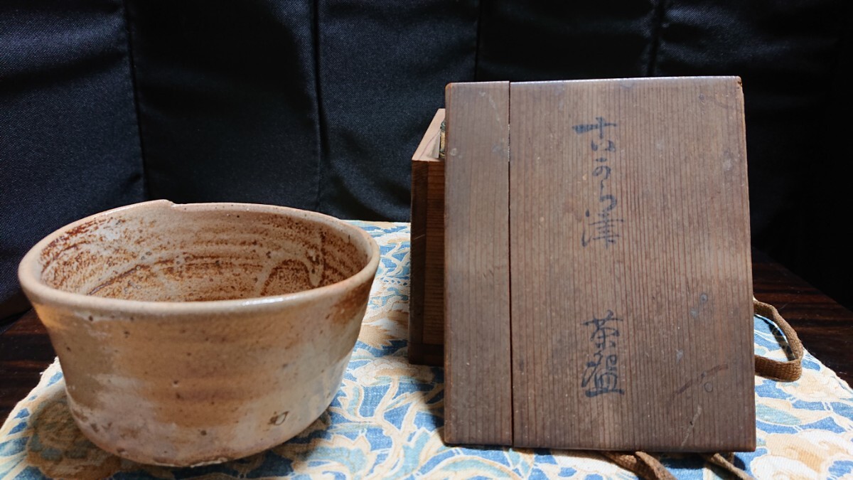 古唐津の茶碗です。古い共箱には、金襴緞子が共布として、入ってます。高台の畳擦れは角が取れて滑々で良い状態です。古い共箱は、かなり痛みが激しく、修復が必要ですが、このままで出品致します。幅9.3〜11.5センチ、高さ7.5センチ。宜しくお願い致します。