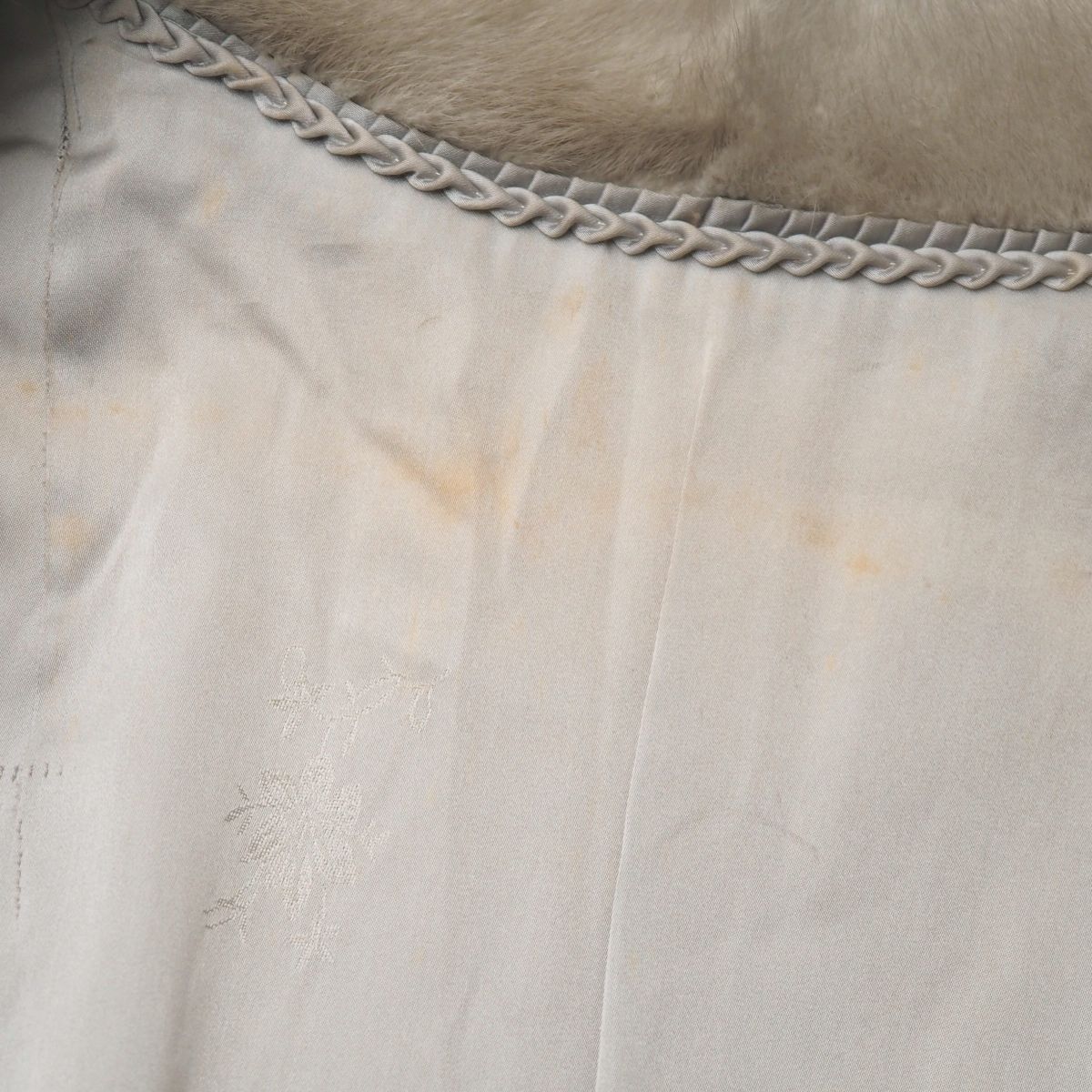 【コンディション詳細】 裏地全体的に薄く変色や薄汚れが見られますが、他大きなダメージ等はなく今後も十分ご愛用いただけるコンディションです。 |