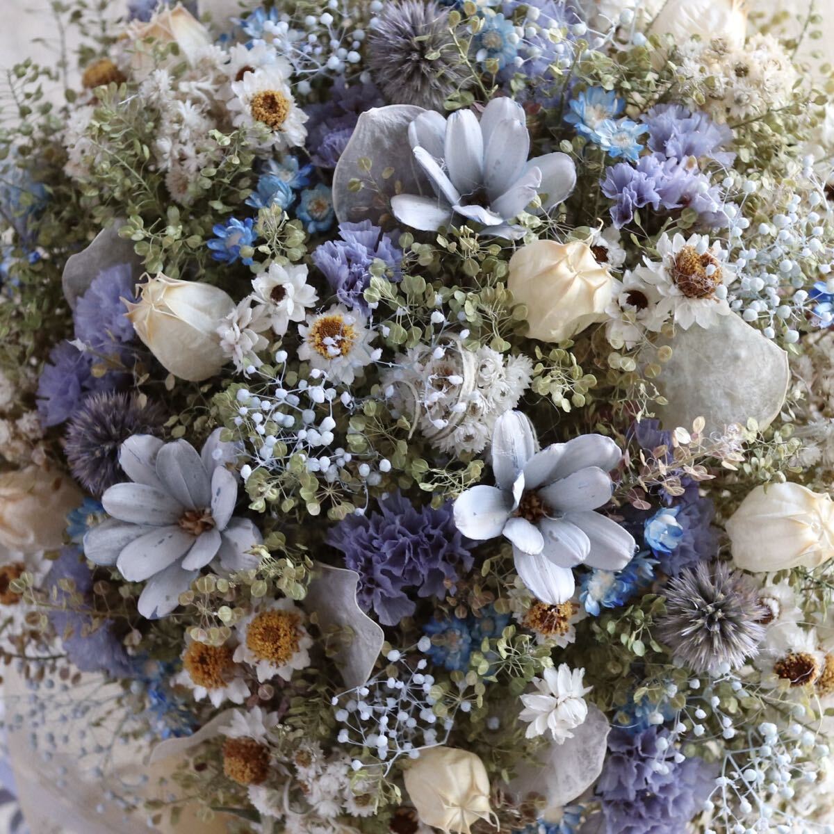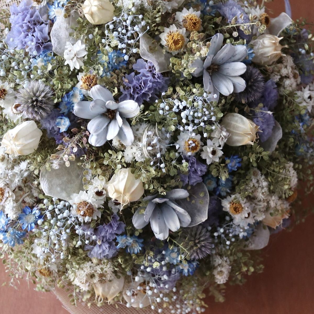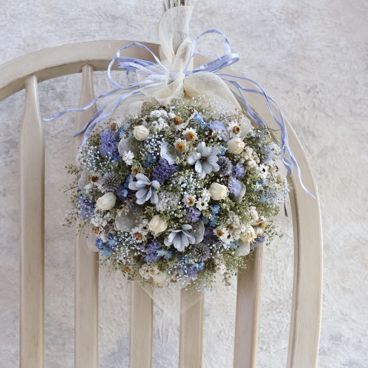 ※こちらのスワッグは他の作品と合計3点まで同梱可能です。同梱時は2点で送料+200円、3点で送料+400円になります。 ※他のサイトでも販売しておりますので、急に出品を取り消す場合がございます。 小さな丸い実が可愛いマメグンバイナズナをベースに、水色、アイボリー、ホワイトのお花をギュッと詰め込み、細かく作り込んだコロンとまあるいスワッグです。 ナチュラルなメッシュのラッピングペーパーでふんわり包んで水色のペーパーラフィアのリボンを合わせ優しい雰囲気にまとめました。 ドライフラワーをメインにハンドメイドフラワーとプリザーブドフラワーを組み合わせて作っております。長持ちする花材で作っておりますので、綺麗な状態で長く楽しんでいただけます。 麻紐のループが付いておりますのでフックやピンに掛けて飾っていただけます。 画像10枚目は梱包例です。 無料でリボン、メッセージカードもお付けできます。 使用花材 プチフラワー(ハンドメイドフラワー) かすみ草(プリザーブド) マメグンバイナズナ、スターチス、ヘリクリサム、ルリタマアザミ、ヤマハハコ、スターフラワー、ニゲラの実、ラフィアのリボン等 全体の長さ35cm 横幅23cm 持ち手とラッピングペーパーを除いたお花部分の長さ20cm 横幅23cm 厚み12cm ドライフラワーは自然のものですのでゆっくり退色していき、 徐々にベージュ系の色合いに変化します。 直射日光を避け、できるだけ湿度の高い場所を避けて飾っていただければ綺麗に長持ちいたします。 ※商品の性質上、輸送中のわずかな実や葉落ちはご容赦ください。 |