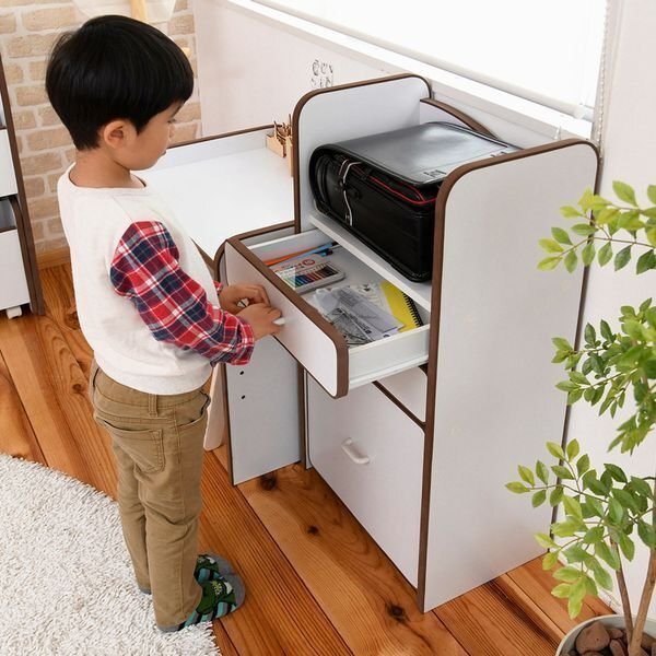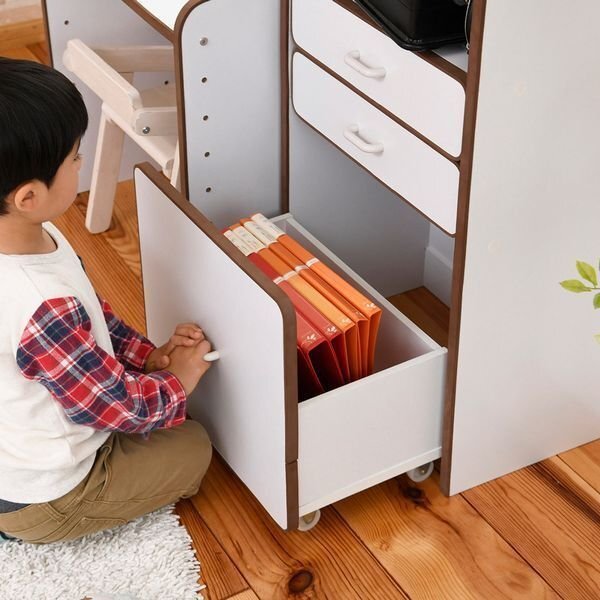 | 弾力性、衝撃吸収に優れたEVA樹脂をすべてのフチに採用。 さらに角を丸くして金具の使用を極力減らした、小さなお子様も安全にご使用いただけるシリーズです。 ランドセルを置くのに最適なスペースの天板や大きさの異なる引き出しなど多様な収納部が、 お子様の整理整頓の力をアシスト。 自分で考えてお片付けをする習慣が身に付きます。 大きい引き出しはキャスター付きなのでお子様の力でも楽々引き出せます。 |