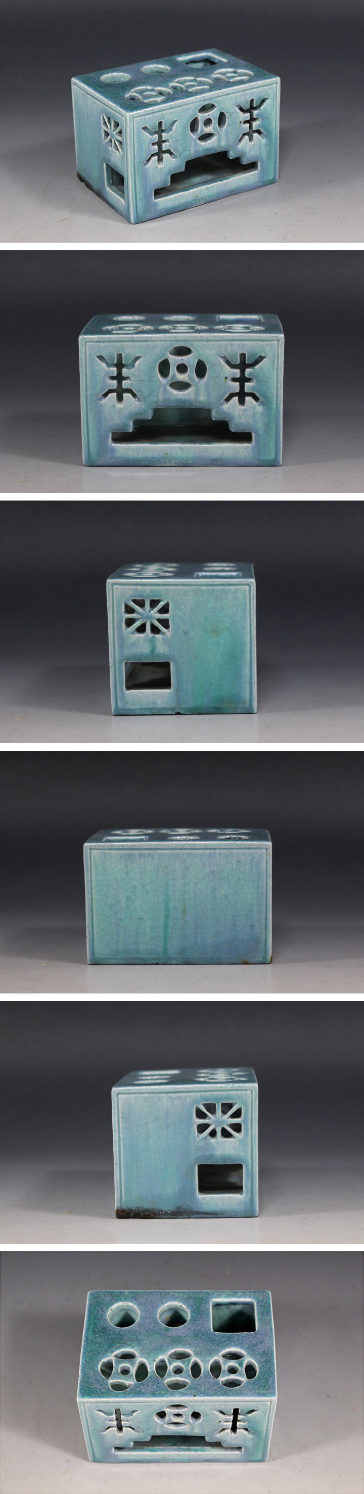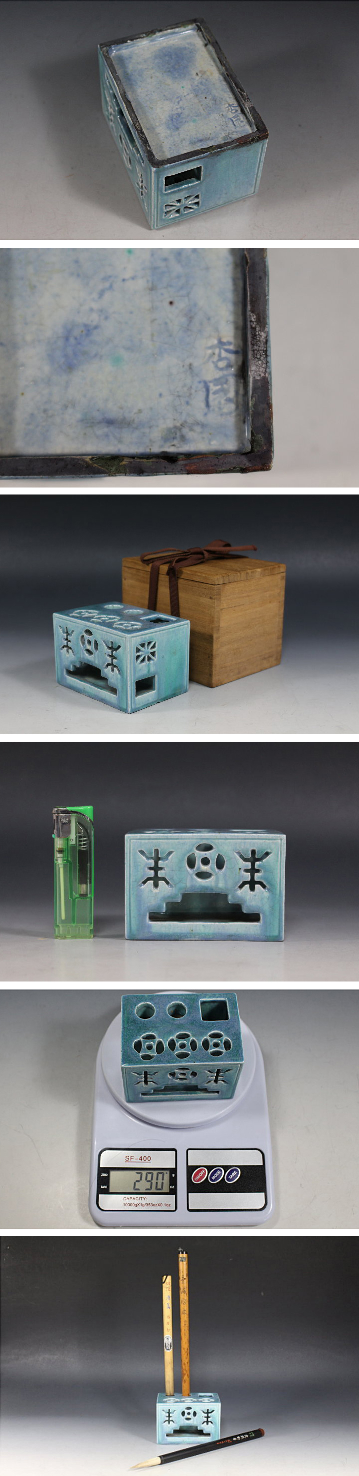 サイズ:高6.0cm 鈞窯筆挿・筆立です。 清朝末 民国期でしょうか? 詳しくは分かりません。 目立つ大きな傷みはありません。 桐箱入り。 ちょっと一休みの時に便利な一品です。 筆置に置いたままだと穂先が乾燥し固まってしまいますが、 筆立てを利用すると穂先の乾燥を防ぎます。 写真をご覧の上ご入札宜しくお願い致します。 | |