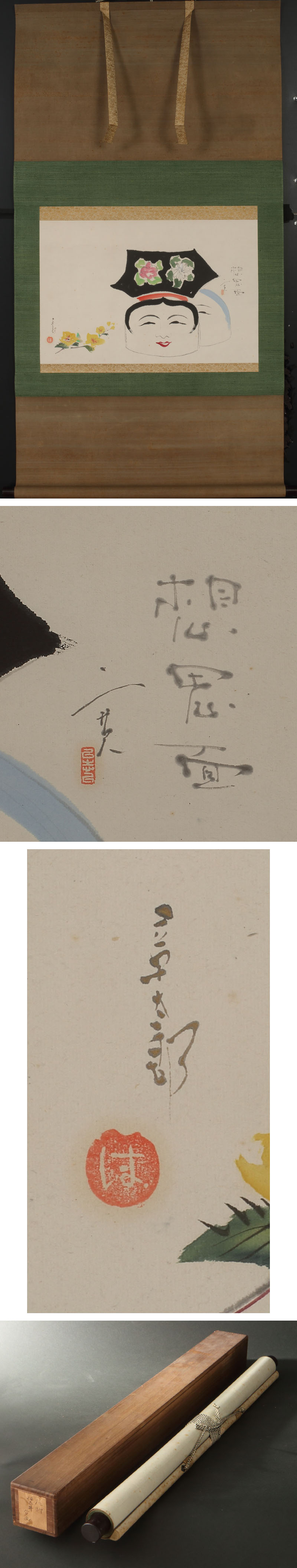 花柳章太郎・伊志井寛の合筆水彩画です。 花柳がハイビスカスとみられる花、伊志井が満州(中国東北部)の土人形、もしくはかぶり面(大頭頭)を描いた一幅です。二人は喜多村緑郎門下の若手スターとして銀幕を飾り、花柳はのちに人間国宝、伊志井は黎明期のテレビドラマの名優として名を遺しました。 特に伊志井は郷土玩具や江戸文化に関心を寄せ、宮尾しげをと共に趣味誌『ほうずき(ほゝづき)』を創刊したことでも知られます。円熟の境地の逸品です。 ◆花柳章太郎 大正-昭和期の俳優。喜多村緑郎に師事。新派の革新,活性化をめざし,新劇座、新生新派を結成した。戦後は初代水谷八重子とともに新派をひきいた。当たり役「花柳十種」を自選。昭和35(1960)年人間国宝,昭和39(1964)年文化功労者。昭和40(1965)年没、70歳。東京出身。本名は青山章太郎。俳名は章魚。著作に「きもの」「役者馬鹿」など。 ◆伊志井寛 大正-昭和期の俳優。四代目三升家小勝の子。石井ふく子の父。大正8(1919)年文楽の3代竹本津太夫に入門,竹本津駒太夫を名のる。同11(1922)年から映画にも出演。昭和3(1928)年新派にはいり喜多村緑郎に師事し,新生新派の結成に参画。テレビドラマ「カミさんと私」「ありがとう」などに主演した。昭和47(1972)年没、71歳。東京出身。本名は石井清一。 付属:時代箱が付属します。 寸法:縦118cm、横64cm(最大幅。若干の誤差はご了承下さい) 状態:経年のイタミがございます。 |