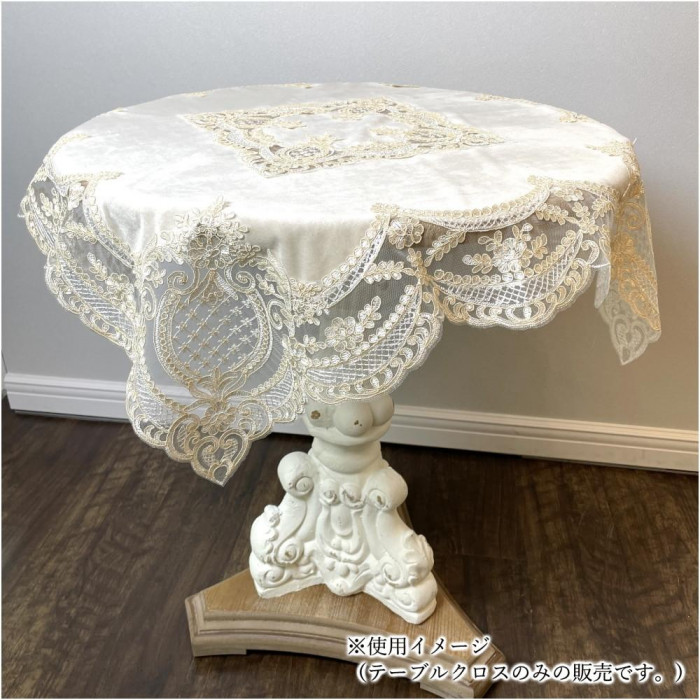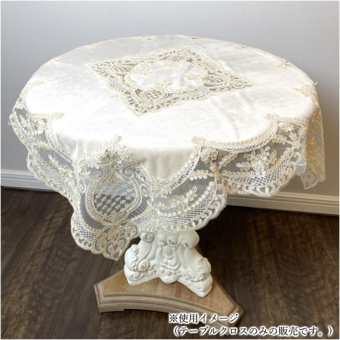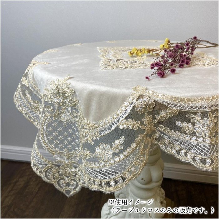 | 美しいベージュと白糸の細やかな刺繍と、淡いベージュ系ニュアンスカラーのベロア生地のコンビネーションが上品なテーブルクロス。色々な場所でお使い頂けます。 |