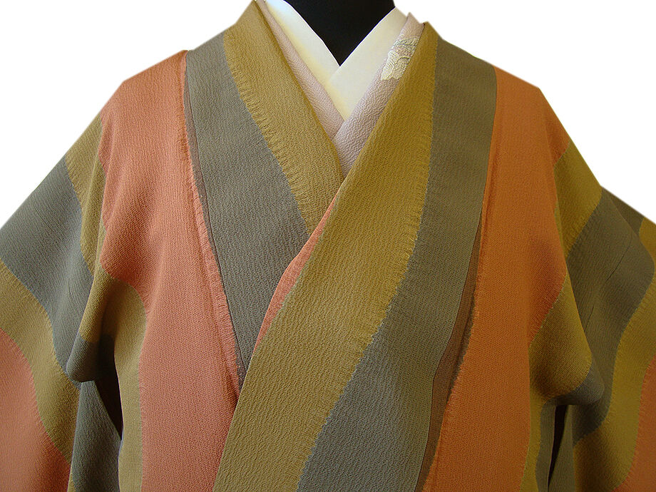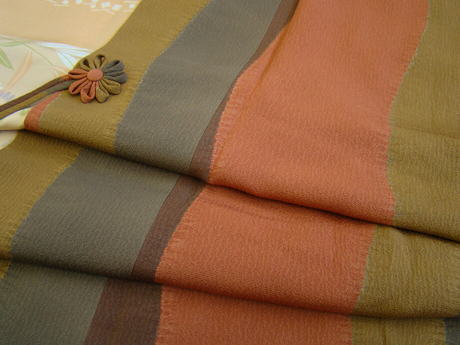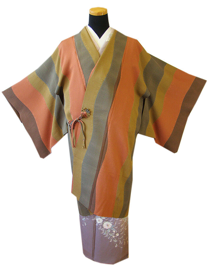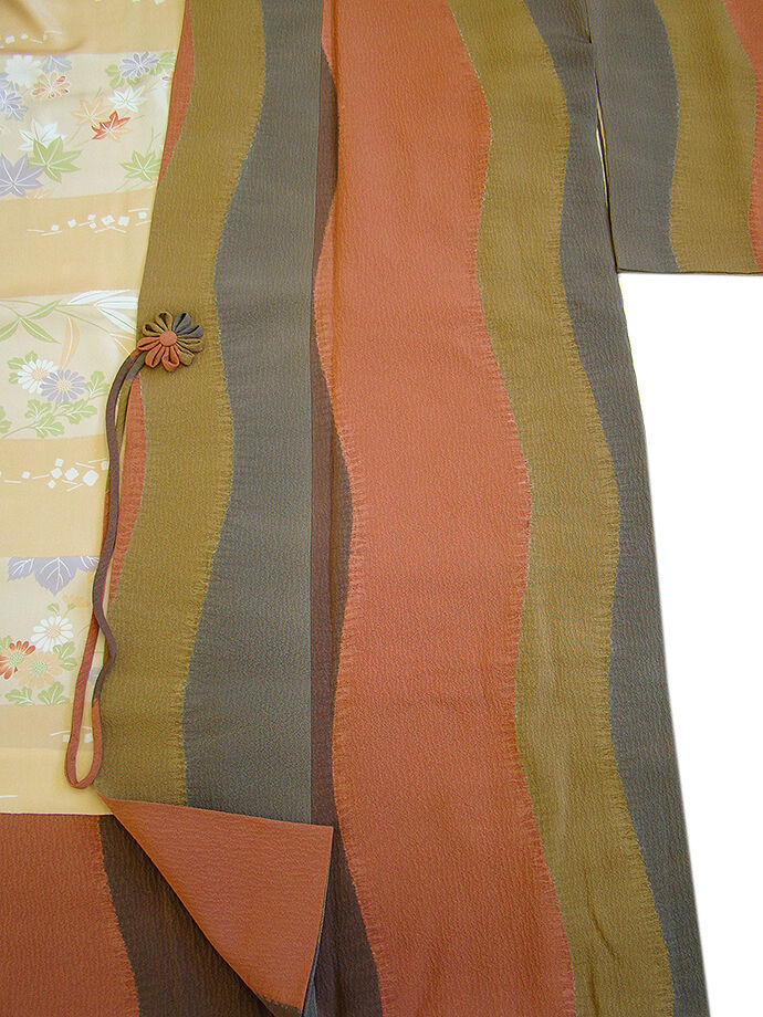 | ちょっと一言 | 柔らかなぽってりとした極上ちりめん地の落ち着きある色彩がコーディネートしやすい 洒落感溢れる素敵な着物姿を奏でる道中着です。 |