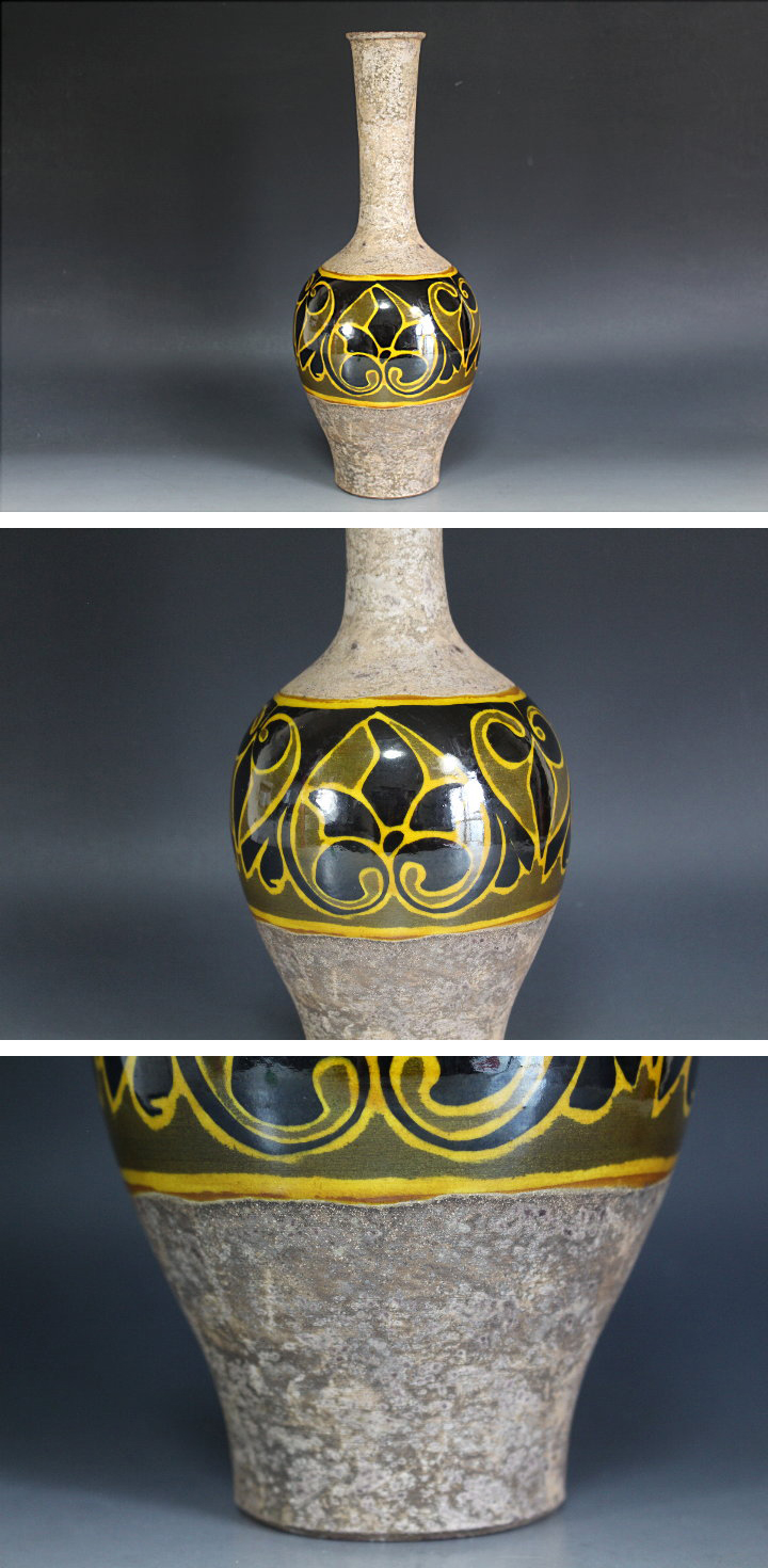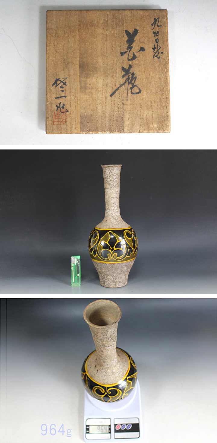 サイズ:高30.9cm 九谷焼無形文化財保持者/松本佐一氏の花瓶です。 幾何学文のスッキリした作品です。 目立つ大きな傷みはありません。 箱には経年の汚れ・ヤケなどの傷みがあります。 共箱。 写真をご覧の上ご入札宜しくお願い致します。 ◇松本佐一 まつも-とさいち 昭和5~令和3(1930~2021) 金沢市に生まれる。曾祖父は九谷焼の名工松本佐平。 昭和26年に金沢美術工芸専門学校を卒業。 後、京都の国立陶磁器試験所伝習生となる。 翌年金沢に戻り第8回日展に初入選。 昭和52年・昭和63年に同展で特選受賞。 昭和60年より吉野谷村に登窯を築く。 平成11年に石川県九谷焼無形文化財資格保持者に認定。 伝統的な色絵から独自の銀彩まで幅広い陶技を持つ。 ※ タイトルの「検」以下は検索ワードです。 出品物と直接関係の無い名称も含まれます。 | |