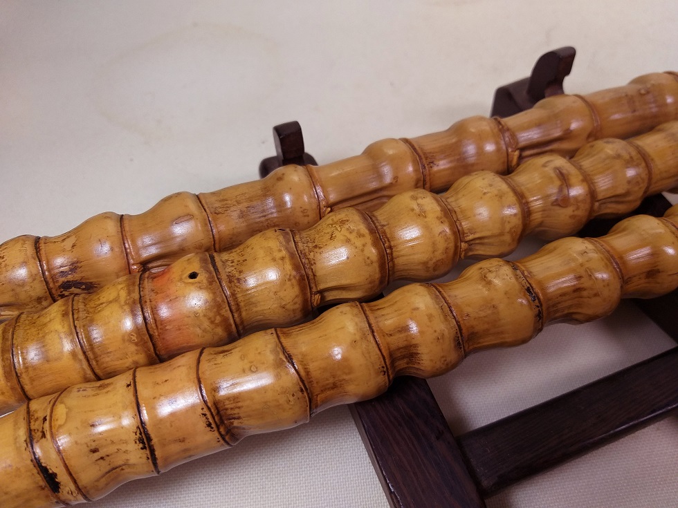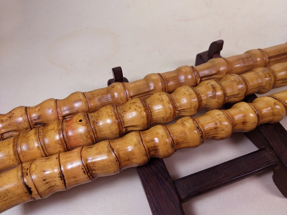 現在出品のこの4本の竹材の状態は、竹材のよく使う布袋の竹節の部分には、致命的な裂け、虫喰い、傷、欠け、変色、材質劣化等の深刻な問題はほとんどありません。また、火通り(火で炙り人工的に真っ直ぐに矯正する)、石染め、蝋煮(蝋液で煮る)、湯で煮る等の人工的加工処理は、一切されていません。