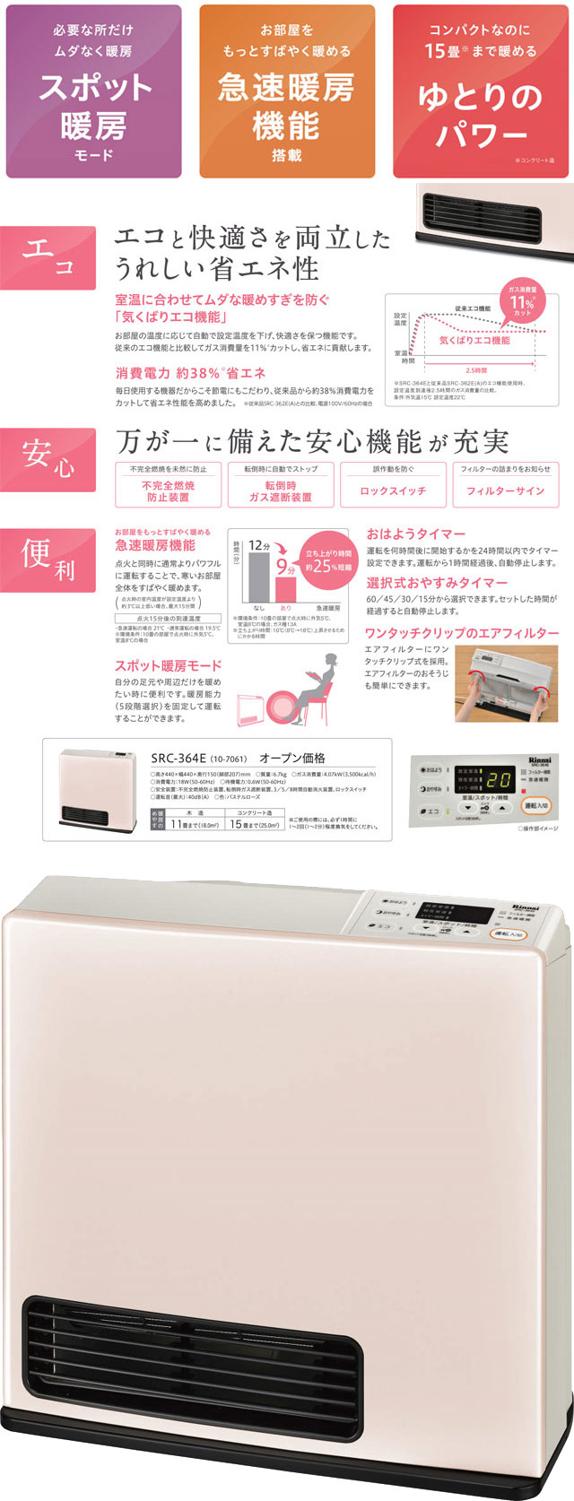 リンナイ ガスファンヒーター SRC-364E を出品いたします。 ■特徴■ 室温に合わせてムダな暖めすぎを防ぐ 「気くばりエコ機能」 お部屋の温度に応じて自動で設定温度を下げ、 快適さを保つ機能です。 従来のエコ機能と比較してガス消費量を11%カットし、 省エネに貢献します。 消費電力約38%省エネ 毎日使用する機器だからこそ節電にもこだわり、 従来品から約38%消費電力をカットして 省エネ性能を高めました。 お部屋をもっとすばやく暖める急速暖房機能 点火と同時に通常よりパワフル運転することで、 寒いお部屋全体をすばやく暖めます。 スポット暖房モード 自分の足元や周辺だけ暖めたい時に便利です。 暖房能力(5段階選択)を固定して 運転することができます。 おはようタイマー 運転を何時間後に開始するかを24時間以内で タイマー設定できます。 運転から1時間経過後、自動停止します。 選択式おやすみタイマー 60/45/30/15分から選択できます。 セッとした時間が経過すると自動停止します。 ワンタッチクリップエアフィルター エアフィルターにワンタッチクリップ式を採用。 エアフィルターのおそうじも簡単にできます。 ■仕様■