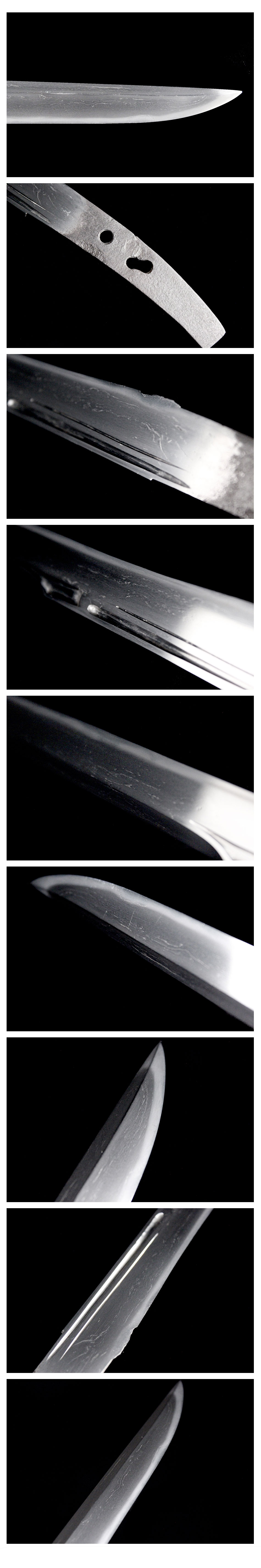 刀身長:約23.2cm 反り:約/cm 目くぎ穴:2個 元幅:約21.7mm 元重:約4.3mm 先幅:約14.9mm 先重:約2.3mm 刀身重:約95g 棟:庵棟 ハバキ:銅 |