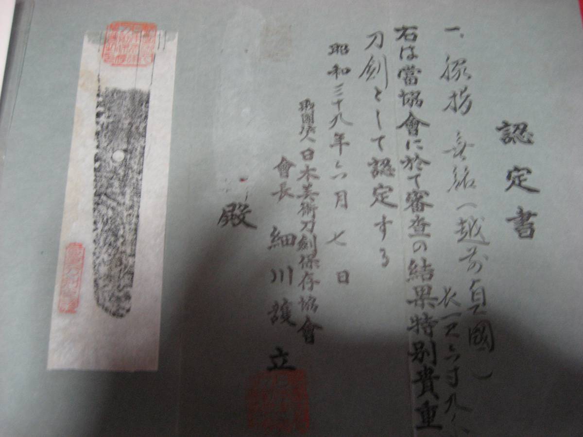 うぶだし骨董認定書付き特別貴重刀剣無銘越前名刀2代貞国(無銘)鑑定書にて肥後貞国