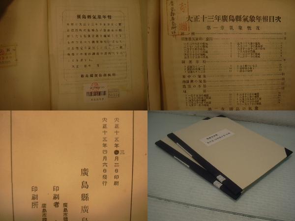 | ●内容-詳細・統計等多数 ●「気象5年報」自対象10年~至大正14年・発行-昭和2年 ◎目次抜粋- ★気象概覧 ★平均気圧 ★平均気温 ★水蒸気張力 ★平均湿度 ★降水量 ★降水観測回数 ★雲量 ★量別降水日数 ★日照時数 ★地面温度 ★地中温度 ★封速度 ★方向別風向観測回数 ★暴風日数 ★平均蒸発日量 ★最高最低気圧 ★時別-月別-年別- ●「気象年報」大正13年-発行大正15年 ★気象概況・総概 ★顕著簿風雨並に豪雨 ★顕著事項 ★寒中の気象 ★地震 ★気象表 ●本のサイズ-B5判・22+53ページ ●本の状態・A4サイズカバーに製本帯紙・-表紙と小口は経年の傷み汚れ染み有り-本文は並本-汚れ染み ◎大学図書除籍本-図書印-管理シール・除籍印等多数有り・ 編集・広島県広島測候所 発行年:1926年~ 冊数・2冊 出版元:広島県広島測候所 ☆詳細は画像にてご確認下さい。 中古品の状態評価には個人差がございますので ご理解の上ご入札下さい。 ご不明な点はご入札前にお問い合わせ下さい |