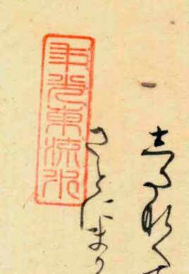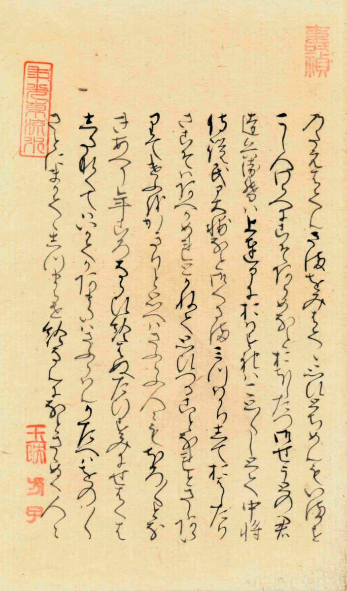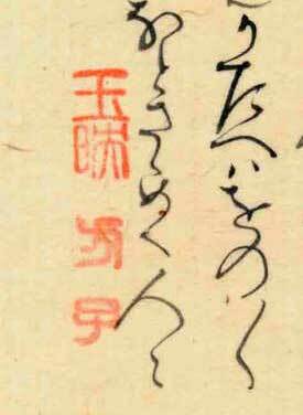 原本自筆上部には、「年光東流水」(年光東流の水)漢文の篆書印が押捺されている。言葉の意味は、「時間の流れは東へと流れる川の水のように止まることなく流れてゆく」です。白楽天の有名な漢詩です。紫式部が「真木柱」を書くに際し、「白楽天・漢詩集」の漢詩を熟読したうえで「源氏物語」の「真木柱の巻」を書いていることがわかります。この原詩の言葉の引用は、「真木柱の巻」に用いられていることで広く知られている。紫式部がこの原詩に親しんでいたことがわかる。
