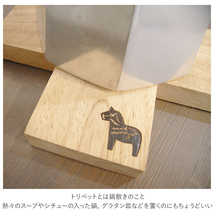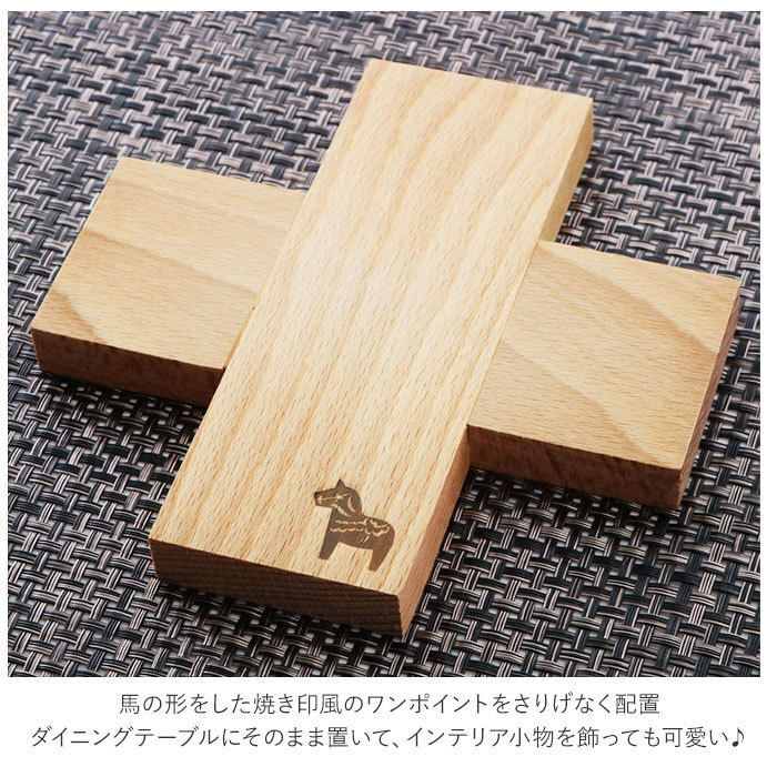 | 商品説明 | ・ナチュラルな木目の表情が優しい、シンプルなクロス型のトリベット。 ・トリベットとは鍋敷きのこと。熱々のスープやシチューの入った鍋、グラタン皿などを置くのにもちょうどいい。 ・ひとつひとつ表情の異なるブナ材を使用。使い込むほどに素材の色合いが深みを増して、木の温もりが感じられるのも魅力。 ・小ぶりなサイズ感なので、鍋敷きとしてだけでなくコーヒーポットやティーポットなどを置けば、おもてなし用にも大活躍。 ・馬を象った焼き印風のワンポイントをさりげなく配置。ダイニングテーブルにそのまま置いて、インテリア小物を飾っても可愛い♪ |