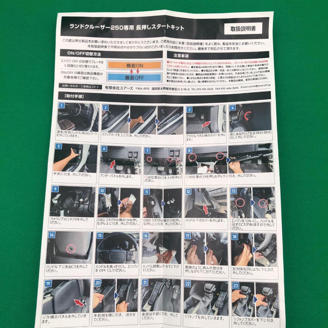 | 商品説明 | ユアーズ ランドクルーザー 250 長押しスタートキット YOURS LAND CRUISER 品番:y608-042 価格:10,800円 新品未使用 撮影のため開封しました 適合車種:トヨタ ランドクルーザー250 2024年(令和6年)4月~ 適合グレード:全グレード適合 ブレーキを踏まずにエンジンスタートボタンの長押しだけでエンジン始動! エンジンを始動時に必ず踏まなければいけなかったブレーキペダルを押す必要が無くなる、超便利パーツが登場! 本商品を取付けることで、ブレーキを踏まないので乗り込まずにスタートボタン長押しだけでエンジンスタートが可能! 車内冷却、暖気の際にもわざわざ車に乗り込まずにスタートボタンの長押しだけで、エンジンを始動することができます。 助手席や後部座席にいる人が手を伸ばしてエンジンをかけることもできるようになります♪ 取付後は、ブレーキペダルを5回連続で踏むことで純正状態に戻すことが可能! 車検時にわざわざ取り外す必要がありません。 純正状態に戻したあと、再びブレーキペダルを5回連続で踏むと長押しスタート機能がONに。 ブレーキペダルでONOFFができるので、後付け感無しでスッキリ! ★取付けに便利な内張はがし付き! ※本製品はOBD差込口を使う商品となりますが、もう一つ繋ぐことが出来るようなハーネス仕様となっております。 |
