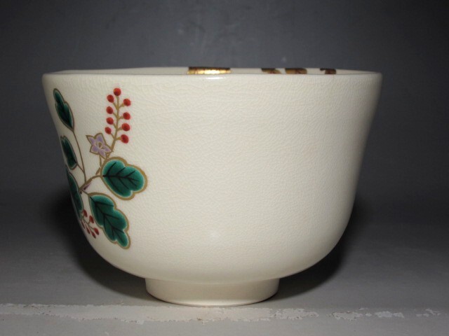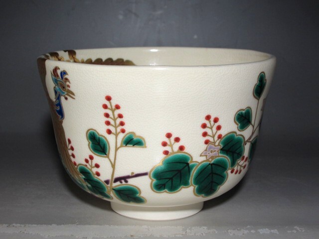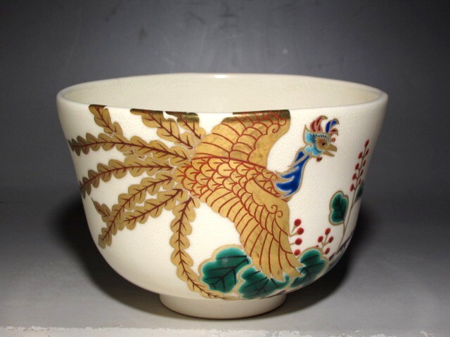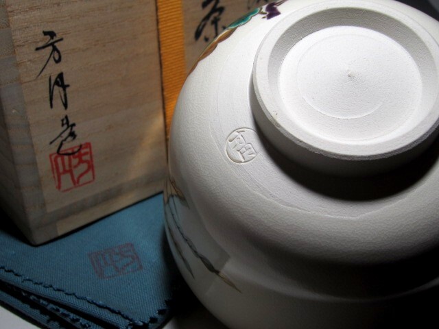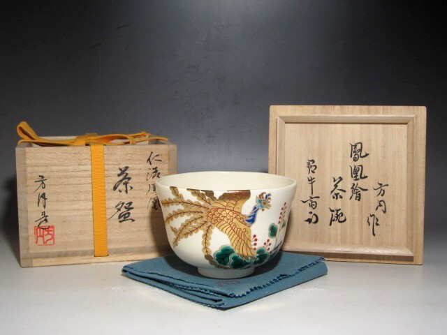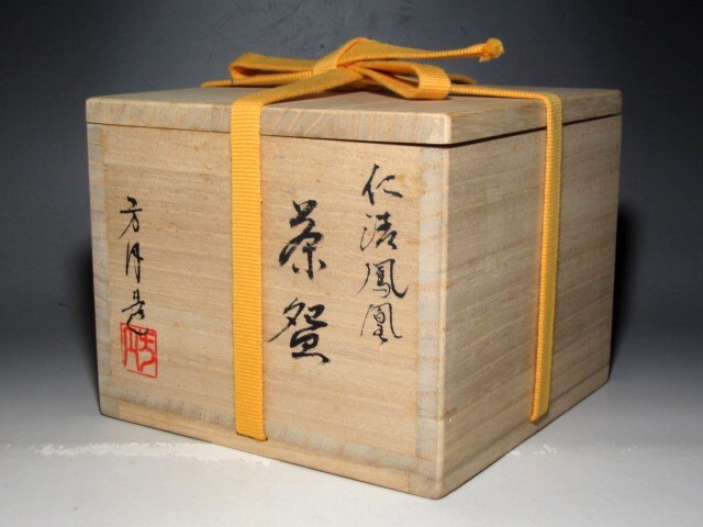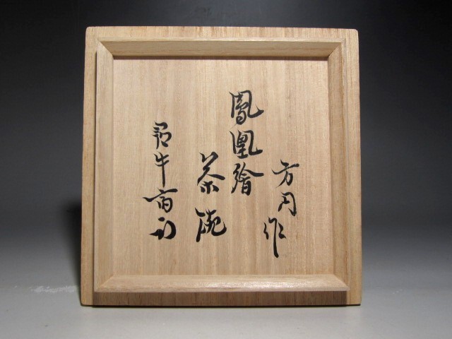 田中方円作の鳳凰文茶碗です。 趣のある素晴らしい作品です。 箱蓋裏に久田流十二代尋牛斎花押があります。 サイズ 直径12.5cm/高さ8cm(多少の誤差はお許しください) 状態 一見して疵やヒビ・直しは見られません。 骨董品という事をご勘案頂き、時代経過のスレや、小さな傷がある場合があるかもしれませんのでご承知置きください。 | |||