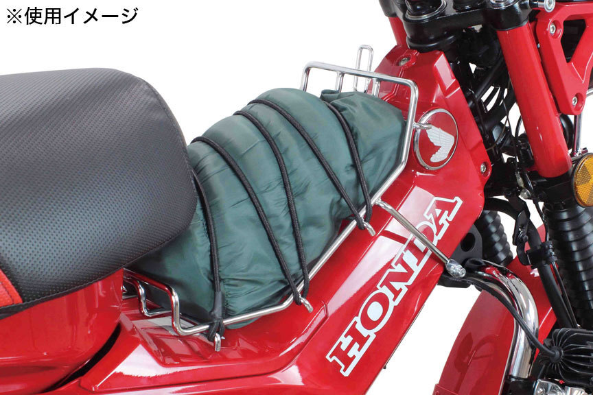 | ●ハンドルとシートの間にあるスペースに本製品を装着することで、レインウェアやバックを付属のゴムロープにより固定することが出来ます。 前カゴ、フロントキャリア、リアキャリア、リアボックスなど前後に荷物を置くのは、盗難が不安という方にもお薦めです。 ●乗車時、シフトチェンジ、リアブレーキ時に影響を及ぼさない範囲で、キャリア面積を大きく確保しています。 又、荷物の脱落を防止する為、下部に荷物止めとなる折り返し、ゴムネットやゴムバンド等を引っ掛ける左右の突起、荷物フックとして使用出来る中央上部の小型フレームを採用するなど、実用性を重視した設計になっています。 表面処理はクロムメッキ。 ●センターキャリアキットには、荷物固定用“ゴムロープ”が付属しています。 ■適合車種 CT125・ハンターカブ(JA55-1000001~) ※推奨積載重量:1.0kg ※取り寄せ品 |