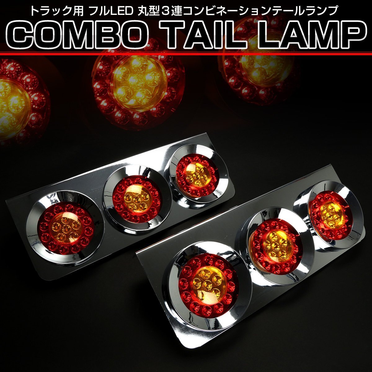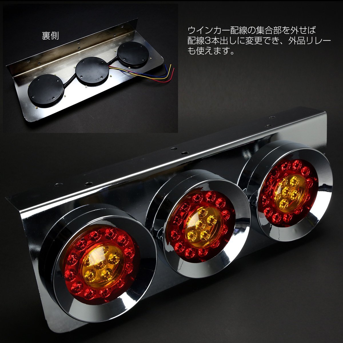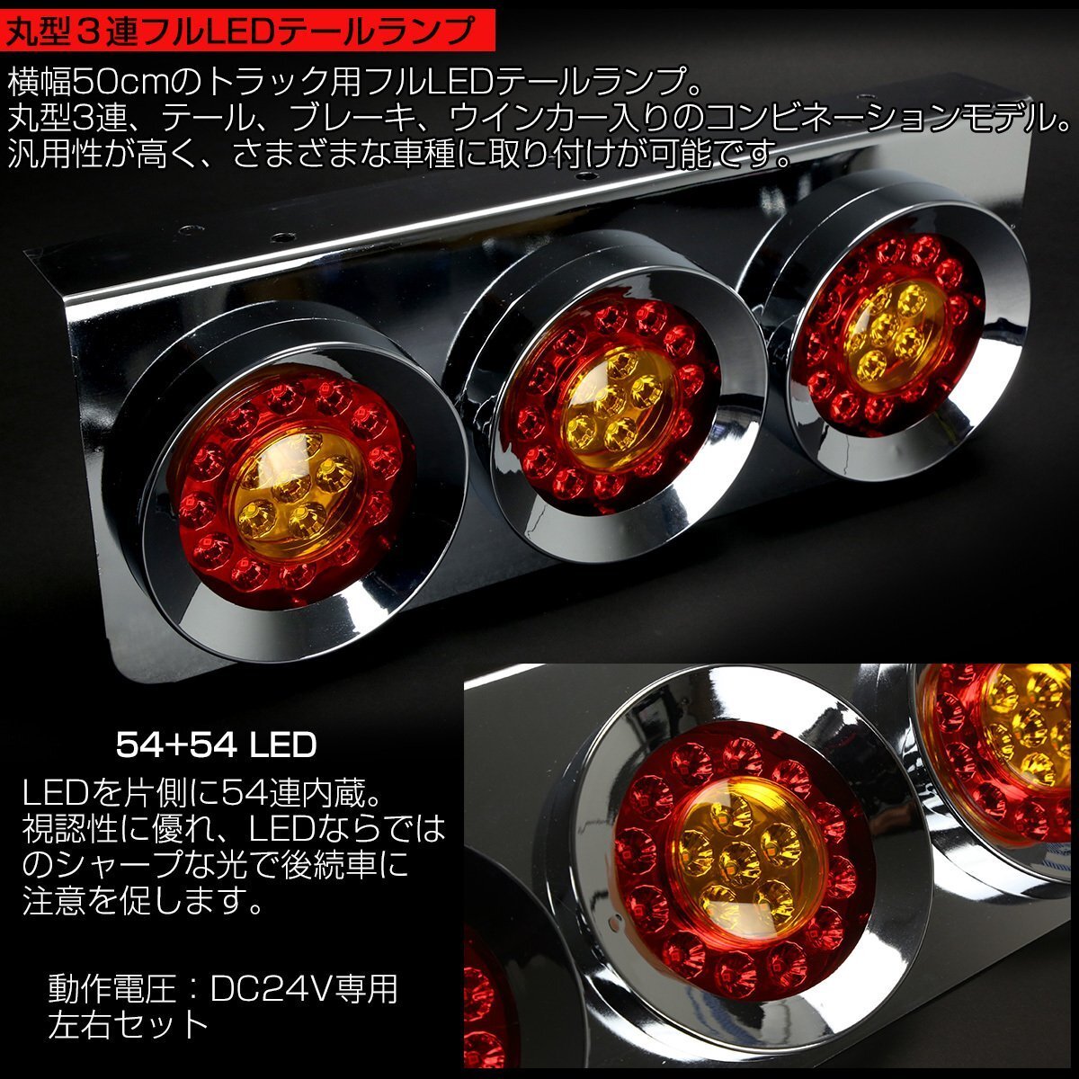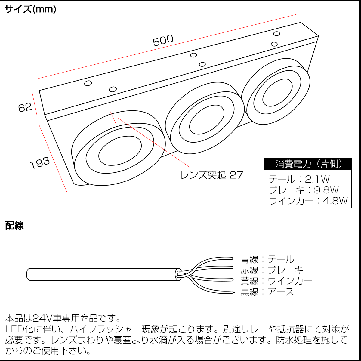 横幅50cmのトラック用フルLEDテールランプ。 丸型3連、テール、ブレーキ、ウインカー入りのコンビネーションモデル。 汎用性が高く、さまざまな車種に取り付けが可能です。 LED化に伴い、ハイフラッシャー現象が起こります。別途リレーや抵抗器にて対策が 必要です。 レンズまわりや裏蓋より水滴が入る場合がございます。防水処理を施して からのご使用下さい。 | ■ 丸型3連コンビネーションランプ ■ 動作電圧:DC24V ■ 消費電力(片側) テール:2.1W ブレーキ:9.8W ウインカー:4.8W ■ セット内容:2個(左右分) ・その他、トラック用品は⇒ こちら | |