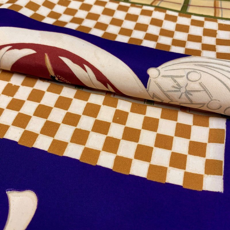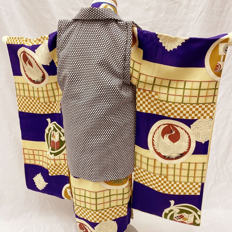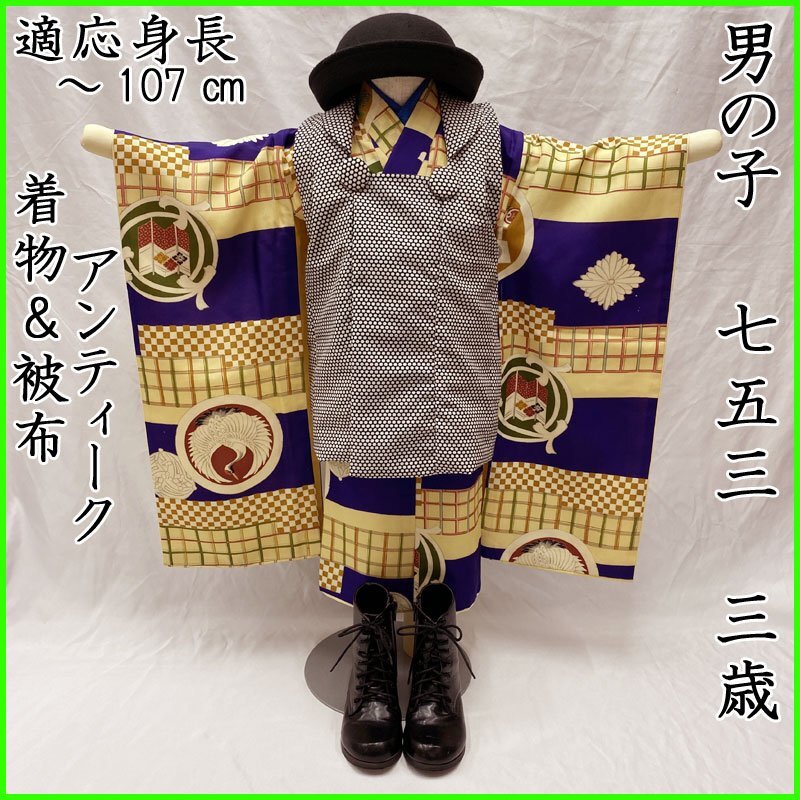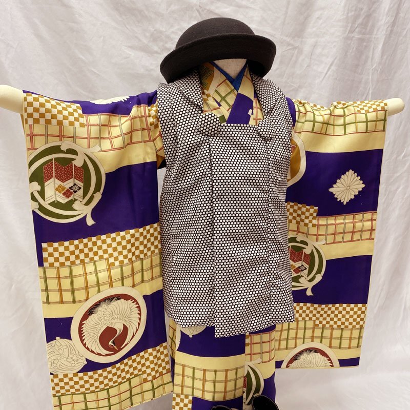 | ◎七五三 三歳 男の子 アンティーク着物&被布 レトロ 紺色◎ (No.gd) こちらの商品は着物、被布です。その他の帽子、楽々衿、半衿、ブーツはセットに含まれません。 人気のアンティーク着物にハンドメイドの被布を合わせました。 紺色と濃いクリーム色の地に、大振りな文様がある七五三3歳のアンティークのお着物です。お宮参りの掛け着から使用可能で、3歳七五三まで、体系によっては袴を合わせて5歳の七五三まで長くご使用いただけます。 (着物)一つ身です。画像以外にも薄い汚れが数か所ございますが、被布で隠れる部分もございます。内側胴裏八掛にアクや薄いシミがございますが、内側なので見えません。アンティークの風合いとお考え下さい。3歳のお着物として使用する際は、肩上げをしておりませんので、お子様の裄丈に合わせてお直しをお願いします。 (長襦袢)こちらには長襦袢が付属いたしません。3歳の七五三で使用する場合は、長襦袢の代わりにお子様の負担が少なく便利な「子ども用楽々衿」をお勧めします。#ag楽々衿 (被布)着なくなった中古品の化繊着物をリメイクしたハンドメイド品です。中綿を入れておりません。胴裏内側に解いた跡がございますが、内側なので見えません。ハンドメイド品ですので、完璧を求める方はご遠慮ください。 【表地素材】(着物)正絹、(被布)化繊 【色】青紫に近い紺色、濃いクリーム色 *モニターによって色味は実際と異なる場合がございます。 【サイズ】(着物) 裄:39.6cm、肩上げ幅:-cm、袖幅:23cm、袖丈:63.2cm、丈(肩から):102.1cm、腰上げ幅:-cm、前幅:15.3cm、後幅:16.6cm (被布) 幅:36cm、丈(肩から):48.3cm *素人採寸のため、多少の誤差はご容赦ください。 アンティーク着物で古い物ですので、それなりのシミや汚れ、ほつれなどダメージ等あるかと思います。現在出回っているアンティーク着物はシミやアクなどのダメージや手直しなど難がある事の方が多いです。多少の目立たないシミやアクに関しては記載をしておりませんので、ご了承ください。新品同様の綺麗さをご希望の方、少しのシミやアク、ほつれなどアンティークに御理解頂けない方のご購入はお控えいただきますよう、お願いします。 | |