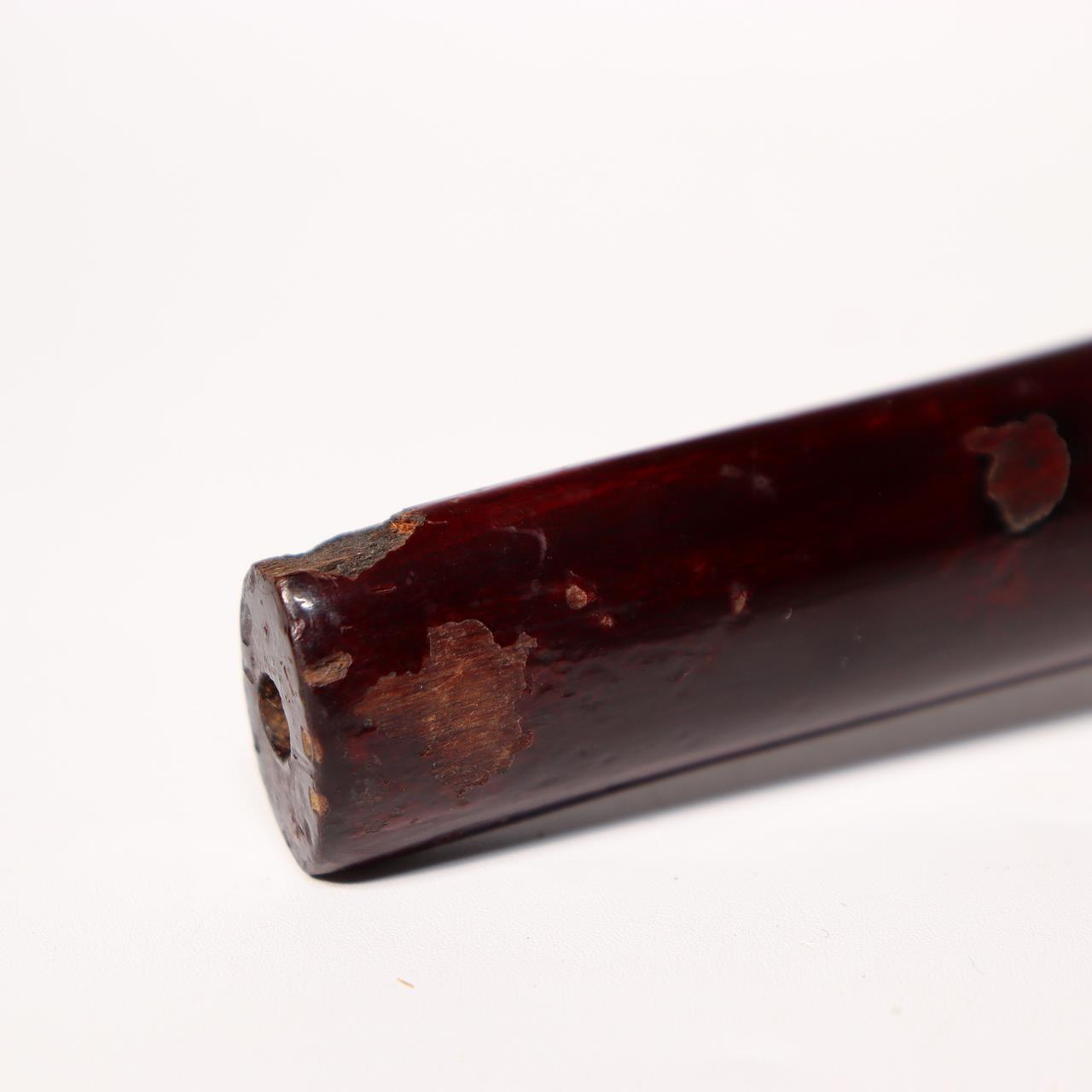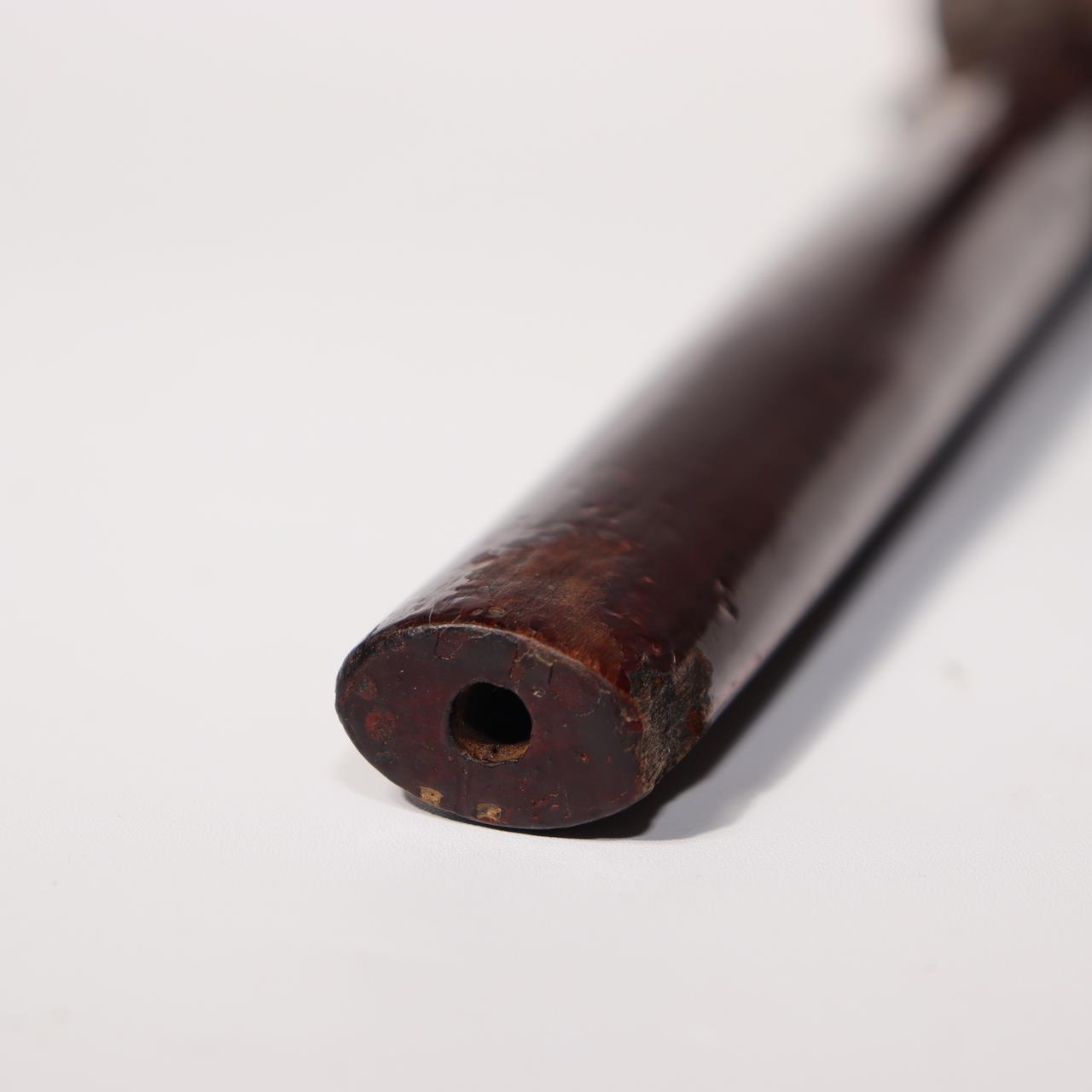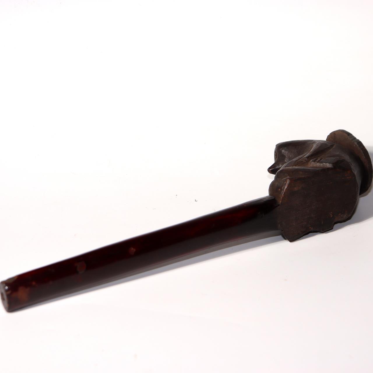 ◆ 商品説明本品は、日本の伝統的な木製煙管で、愛嬌ある狸の姿を精緻に彫り上げた一刀彫作品です。全体が一本の木から彫り出されており、胴部に銘が刻まれています。 喫煙具としての機能を持ちながら、民芸的な彫刻作品としての価値も兼ね備えています。 【サイズ】 長さ:約24cm 幅:約4cm 重量:約63g 【状態】 経年による擦れや漆の剥がれ、使用痕が見られますが、全体としてしっかりとした状態を保っています。 当方は骨董品を中心に取り扱っており、安心してお取引いただけるよう丁寧な対応・梱包を心がけております。 ◆ 商品について