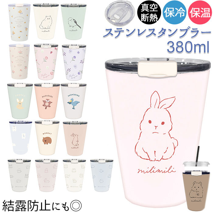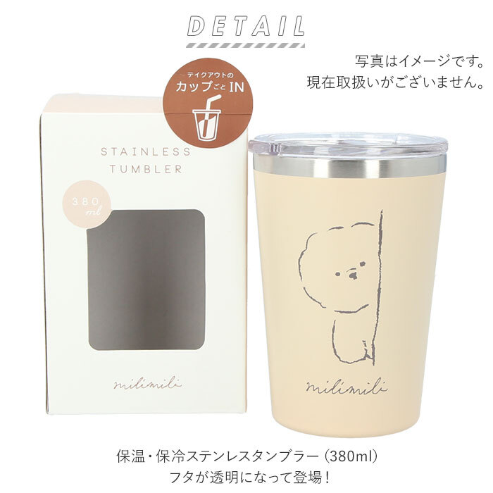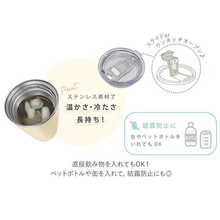| 商品説明 | ・・コンビニのテイクアウトカップごとIN出来る、保温・保冷ステンレスタンブラー(380ml)。フタが透明になって登場! ・ステンレス真空断熱構造で、冷たさ・温かさが長持ち◎(※熱い飲み物を入れて使用される場合は火傷の原因となりますので、必ずタンブラーから出してお飲みください。) ・飲み口部分はスライドでオープン。フタで密閉できるから、こぼれにくく安心♪ ・直接飲み物を入れてもOK! ・ペットボトルや缶を入れて、結露防止にも◎ ・車のドリンクホルダーにも入るサイズ感なので、ドライブに最適◎(※形状により対応していない場合もあります。) ・人気のくすみカラーに可愛らしい動物柄のデザインで、自宅でも職場でも大活躍♪ |