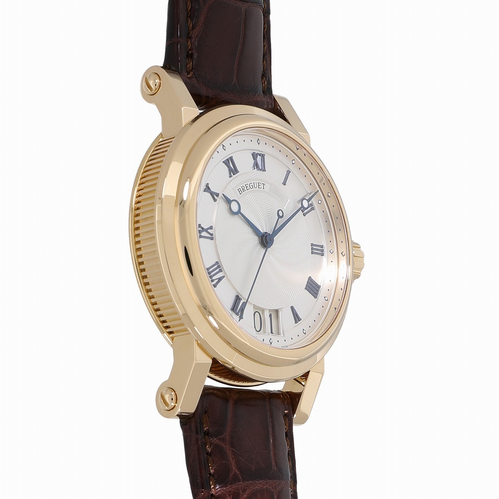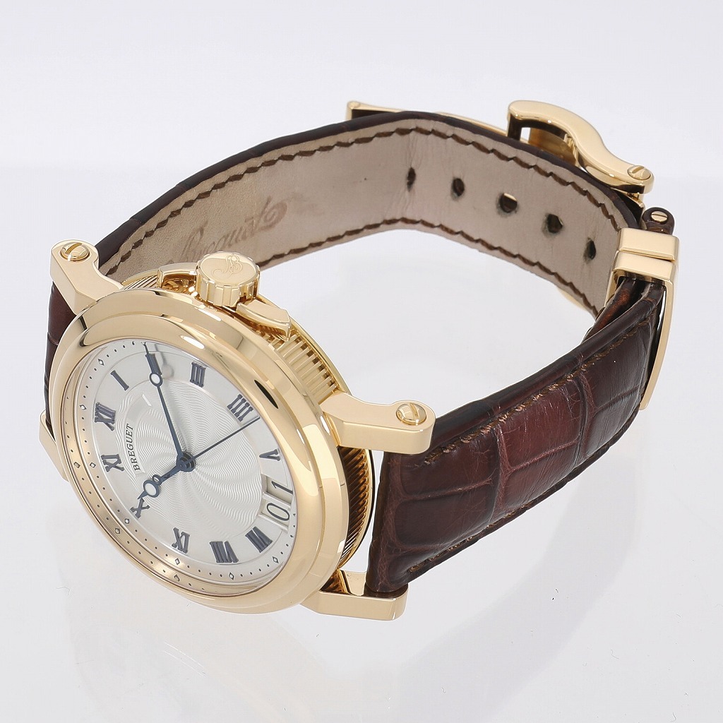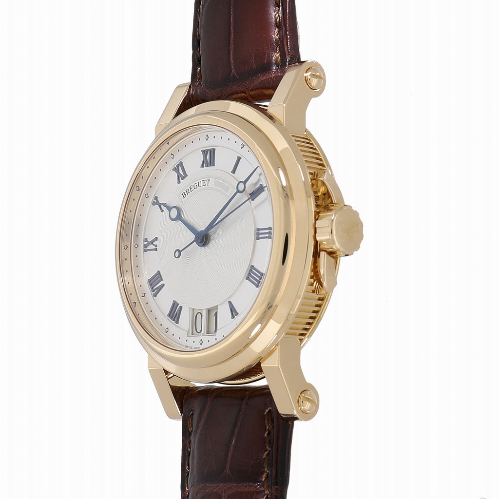 | モデルについて | ブレゲの中でも比較的スポーティで、機能性重視なモデルを揃えるマリーン。こちらは2004年に発表された、非常に人気の高いモデルです。マリーンの名に相応しい、波のようなギョーシェ仕上げや、艶やかな青焼きのインデックスとブレゲ針、ケースサイドのコインエッジなど、ブレゲらしさを存分に感じられるデザインとなっております。ケースにはイエローゴールド、ストラップはアリゲーター製を採用し、スポーティーさとラグジュアリーさを兼ね備えた仕様です。ケースバックからは美しいムーブメントを眺めることができます。 |