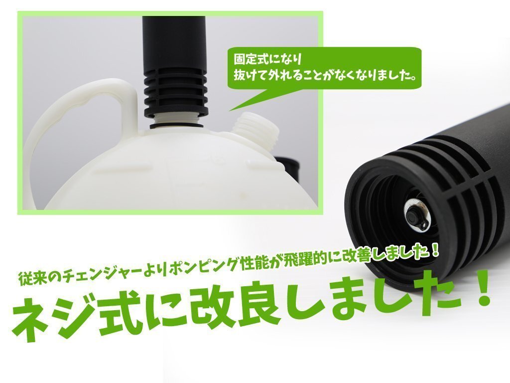 | 特 徴 | レベルゲージ用ストッパー付き ポンピングしても抜けないネジ式の新ポンプ搭載 |
