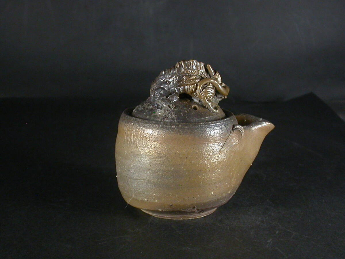 昭和26年岡山県生まれ。備前焼に惹かれ備前陶芸センター卒業後人間国宝山本陶秀・岡山県無形文化財山本雄一親子に師事。県展他入賞。陶秀の陶技・焼成を良く受け継ぎ陶秀譲りのろくろ技術と紐造り・面取等多彩な造形で人気があります。この宝瓶は今回窯出しの最新作で雰囲気のある作りに、焼けは良く焼き締まった地肌に鮮やかな金彩と黄・焦げ茶のゴマがたっぶりと掛り良い雰囲気の作品となっています。高さ約8.5センチ、径約7.5センチ、口までの幅約10センチ。栞付き。