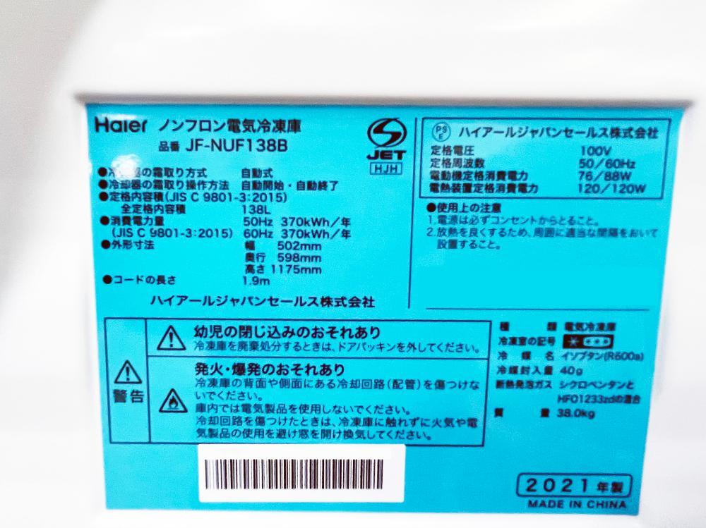 ★引き取りの大歓迎!! ご本人様が直接引取の場合、2,000円値引きます!! 是非お越しください♪ ★お取り置きOK!★ 3ヶ月間までは、無料でお取り置きできます! もしそれ以上の期間をご希望の方は、事前にご相談ください♪ 送料無料★2021年製★極上超美品 中古★Haier 138L スリムボディ★前面タッチ式操作パネル!前開き式冷凍庫【JF-NUF138B】FP0Y ※写真に写っているものが全てとなります。 ◆動作確認は、しっかり長時間(2~3日間)行っており、冷えも良好で問題ございません。 ◆他にも出品しており、ご覧いただければわかりますが、細かすぎるかもしれませんが、私が気が付いたキズ等に関して、できる限りアップ写真を掲載しております。こちらの商品に関しては、私が見る限りで申し訳ございませんが、傷や汚れ等なく、全体的にはとても綺麗で、極上超美品だと思います。 ※但し、中古品の為、私の気づかないキズ・汚れ等あるかもしれませんので、気になる方はご遠慮ください。 是非、ご検討をお願いします。 【商品説明】 ◆家族の食生活を豊かにする前開き冷凍庫 買い物カゴ4個分以上※1収納可能で、まとめ買いOK!離乳食やお弁当のおかずの作り置き、食パンや部活用のドリンクなどの保存ができるので、子育て中も大活躍します。 ◆見やすく整理整頓しやすい「クリアバスケット」 1回ドアを開ければどこに何が入っているか一目で確認することが可能です。また、クリアバスケットのひき出しタイプなので、食材の整理整頓も簡単にできます。 ◆急冷凍モードで素早く冷凍 「アルミトレイ」付き。「急冷凍モード」と合わせて使えば、素早く冷凍できます。 ◆幅約50cmの「スリムボディ」 スペースがないと思っている方へ。レンジラックと置き換えるとメリットも。レンジラックに保存していた乾物は冷凍することで風味やおいしさを長持ちさせます。上に電子レンジが載せられる「耐熱性能天板※2」採用。 ◆使いやすい「前面タッチ式操作パネル」 ドアを閉めたままで温度設定や急冷凍の操作が簡単にできます。また庫内温度-5℃以上が続くとランプが光り、アラームでお知らせします。 品名: 138L 前開き式冷凍庫 品番: JF-NUF138B シリーズ: Haier Live Series 種類: 前開き式冷凍庫 容量(L): 138 定格内容積/冷凍室(L): 138※内は食品収納スペースの目安 電源電圧(V): 単相100(50Hz/60Hz共用) 定格消費電力(W): 電動機 76/88 電熱装置 120/120 年間消費電力量(kWh/年): 370 省エネ基準達成率(%): 123(目標年度2021年度) 外形寸法(mm): 幅502×奥行598×高さ1175 据付必要奥行寸法(mm): 698 質量(kg): 38 JANコード: 4562117087634(ホワイト) 4562117087641(シルバー) 冷却方式: ファン式 フリーザー性能: フォースター 霜取方式: 自動 運転音※: 約25dB ※JIS C9607規定の騒音試験による(安定運転時) 2021年製 詳しくはこちら↓ https://www.haier.com/jp/freezers/jf-nuf138b.shtml ◆動作保証しておりますので、商品到着後3日以内に落札後の商品お取引画面から、動作不良等の内容をメッセージ連絡頂きましたら、初期不良対応は致します。但し、電源が入らない、全く稼働しない致命的な不具合に限ります。 ◆簡易清掃を行っております。 当方としては、清掃を行っておりますが、あえて簡易清掃と言わさせていただきます。 神経質な方や、新品同等のレベルをお求めの方、気になる方はご遠慮ください。 ◆その他、素人なりに慎重に確認したつもりですが、中古品の為、私の気づかない傷や汚れ等あるかもしれません。 専門的・神経質な細かな点までの対応はできませんので、基本的にノークレーム・ノーリターンでお願いします。 ※下記内容を最後まで、必ずお読み下さい。 ご入札・落札の際は、ご了承頂いたものとみなします。 注意事項★☆★☆★☆★☆★☆★☆★☆★☆★☆★☆★☆★☆★☆★☆ ●システム改定に伴い、「 受取連絡 」が非常に重要となりますので、商品到着後24時間以内に受取連絡された方のみ、初期不良対応・保証対象とさせていただきます。 ●私としてで申し訳ございませんが、できる限り誠意ある対応を心がけているつもりですが、顔の見れないお取引が故に色々な方がおり、また人それぞれ感性など異なりますので、ところどころ、あえてと記載させて頂いております。 ●初期不良対応・保証に関して、お届け先へ商品到着後、3日以内が保証対象となります。 ●商品が届いたご住所で動作確認等行ってください。移動しますと保証対象外になります。 ●万が一、商品に不具合等がございましたら、落札商品お取引画面から具体的な不具合等の内容をメッセージして下さい。商品到着後、3日以内メッセージを頂けていない場合は、保証対象外となりますので、必ずお願いいたします。 ●家電に関しては、あえて、電源が入らない・全く稼働しないなどの致命的な不具合、家具類など電気を使わないものは、その物として成り立たない物に限らさせていただきます。 ●動作確認・状態確認が終わるまで、梱包材・運送会社の伝票など必ず保管してください