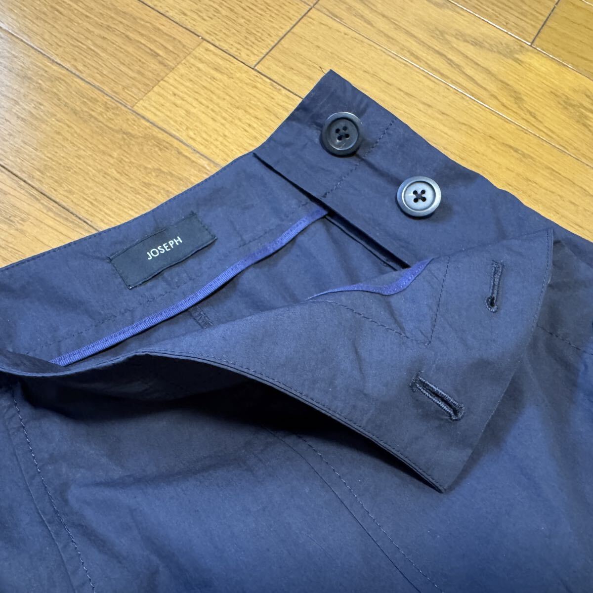JOSEPHジョセフのフレアスカートです。紺・ネイビー色のコットン素材は春夏に大変重宝します。お尻下あたりから広がるマーメイドフレアシルエットは着用時のシルエットがとても美しいです。左サイドを大きめのボタンダウンで開閉して着脱します。家族が所有しておりましたが、衣類の整理が必要となりましたためお譲り先を探しています。着用短時間1回で、大切に保管しておりました。汚れ・傷みはありませんが、自宅保管が気になる方はご遠慮ください。