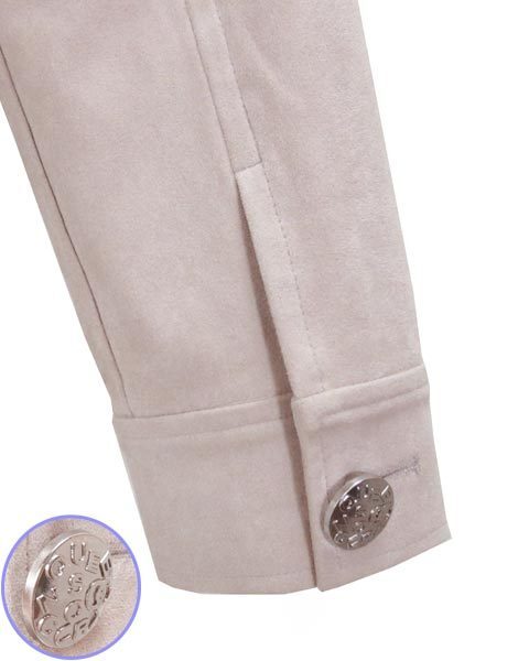 | 薄いグレー味の入ったような淡い可愛いピンクのジャケット。肌触りの良いスウェード調で柔らかめの生地なので着心地が良い。ショート丈で、脚長効果のあるデザイン。お袖のやや大きめのロゴ入りボタンも可愛い。 |