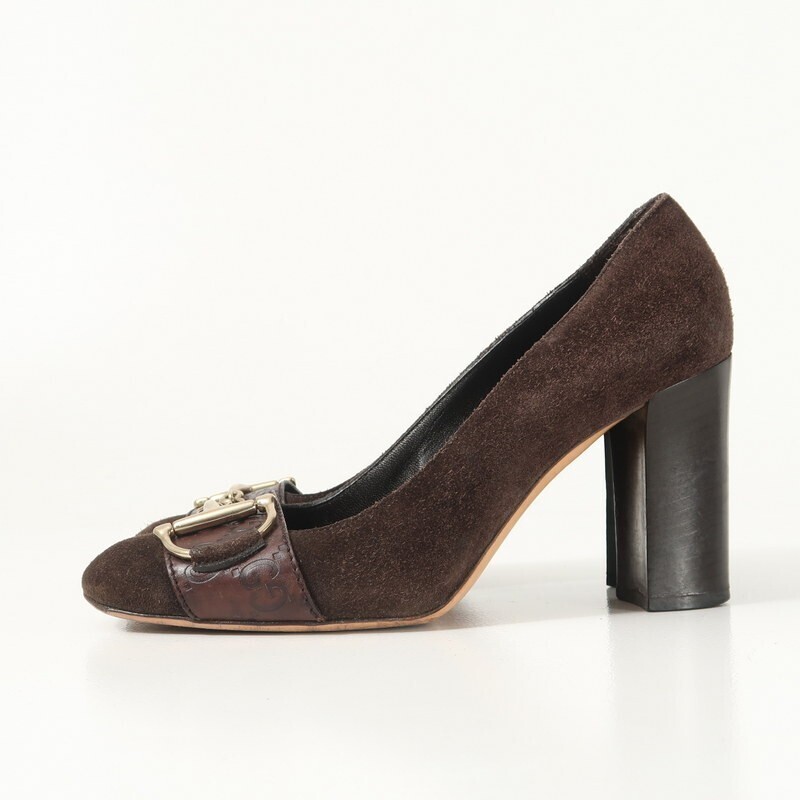 SGS4062▼イタリア製*グッチ GUCCI*スエードレザー グッチシマ GG柄 ホースビット パンプス 36C(23.0cm相当) 靴 チャンキーヒール ブラウン
