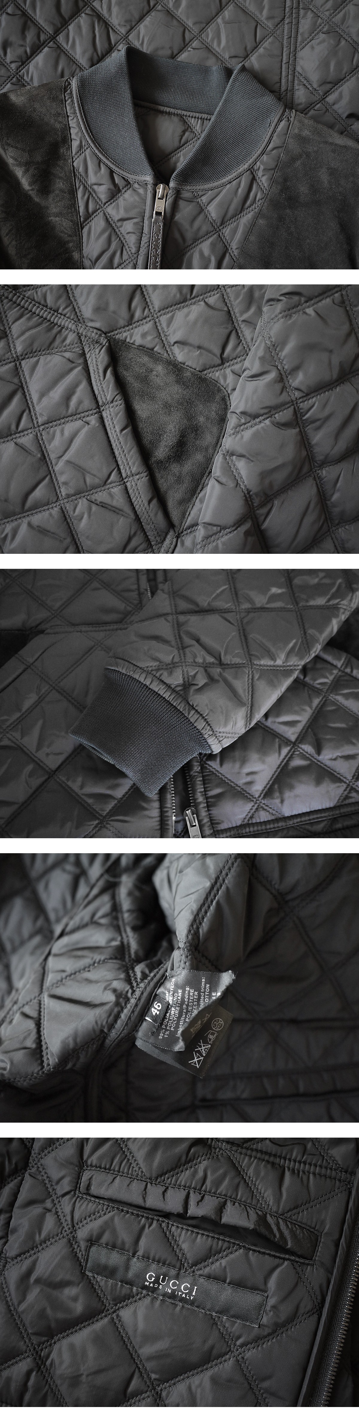 グッチのキルティングライダースブルゾンでございます。適度にコンパクトなボックスサイジングと、すっきりと短めの着丈でバランスよく、グッチの特徴であるモードとラグジュアリーを介在させた逸品です。