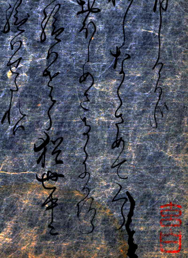 自筆切の稀少価値は、和紙の生成技法の緻密さにあります。上の「拡大断層(MRI)写真」でわかる通り、極めて薄い和紙の上に墨の文字がくっきりと浮き上がるように「和泉式部日記」の和歌が記されております。 出品している自筆の「断層(MRI)写真」の原板は、レントゲン写真と同じ新聞一面(片面)ほどの大きさのフィルムです。肉眼では見ることのできない和紙の繊維の一本一本のミクロの世界を見ることができます。日本国内では医療用以外には見ることのできない自筆の「断層(MRI)写真」です。 自筆切は、一旦表装を剥離し分析と鑑定検査のために「断層(MRI)写真撮影」をしております。撮影後、展示のために再表装をしております。掛軸や屏風にすることが可能なように、「Removable Paste(再剥離用糊)」を使用しているため、自筆に影響をあたえずに、容易に「剥離」することができるような特殊な表装となっております。 |