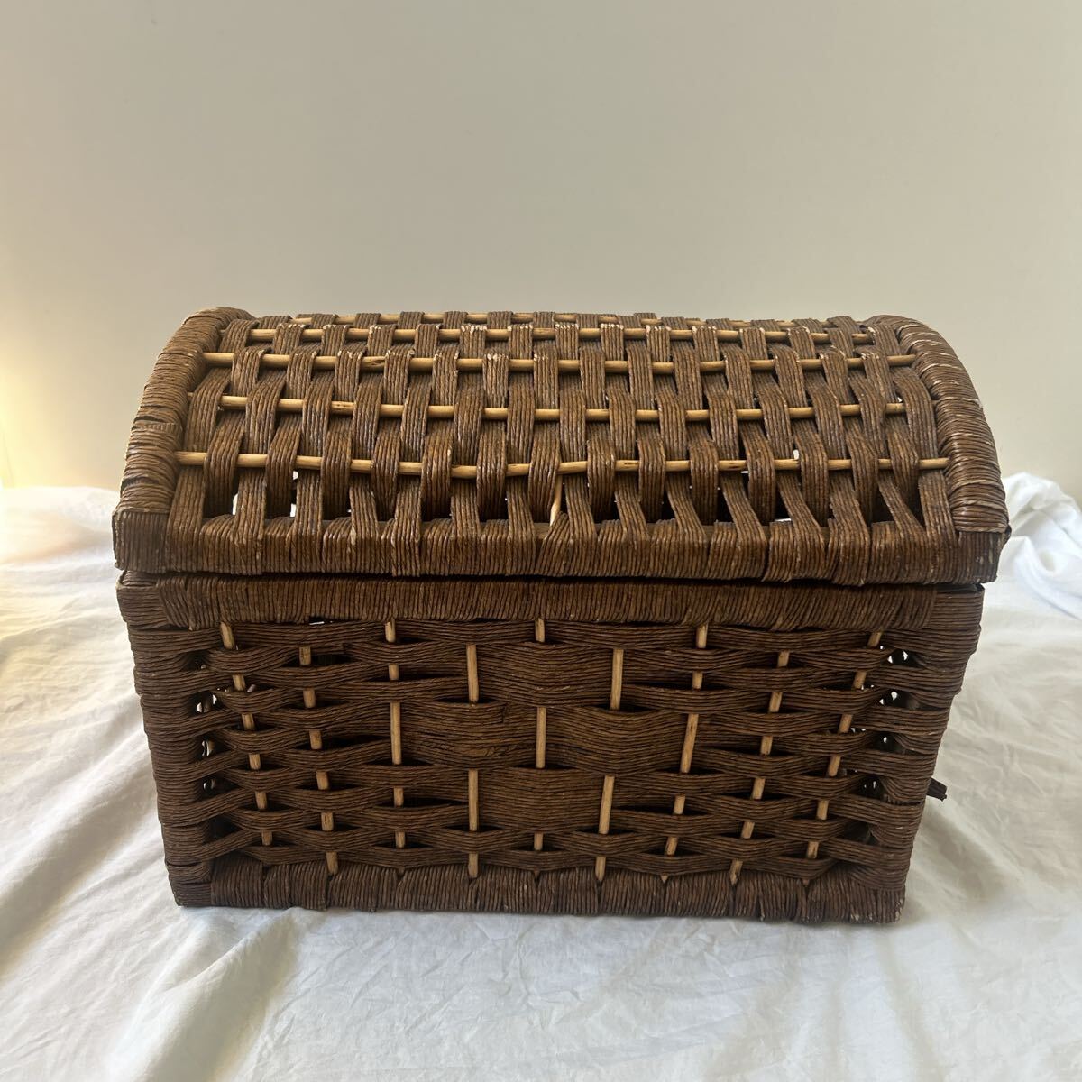 ブラウンの編み込みデザインの中型バスケット、蓋付きで収納に最適。| 出价者 | 信用 | 价格 | 时间 |