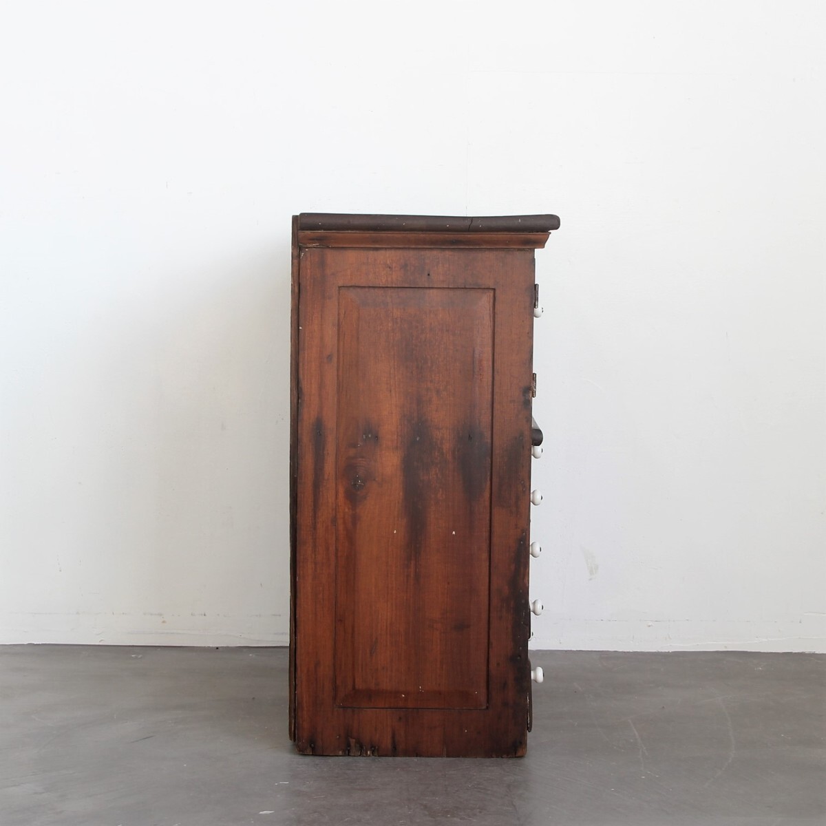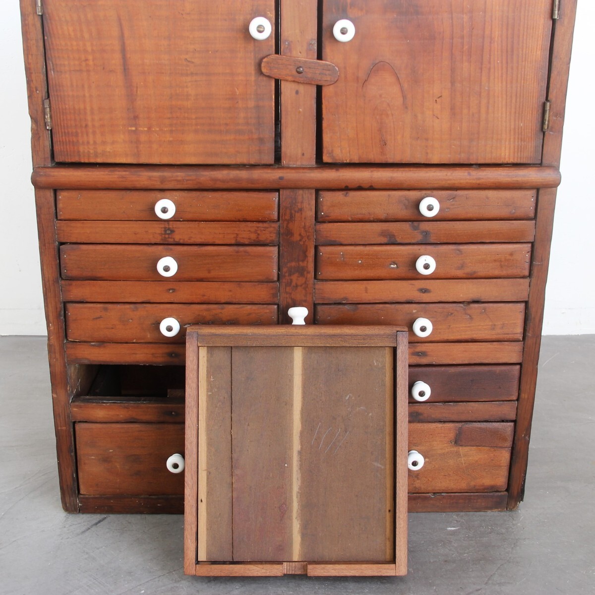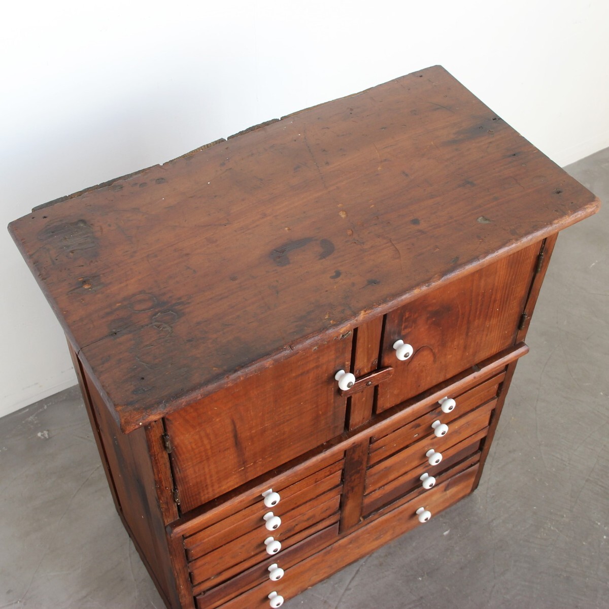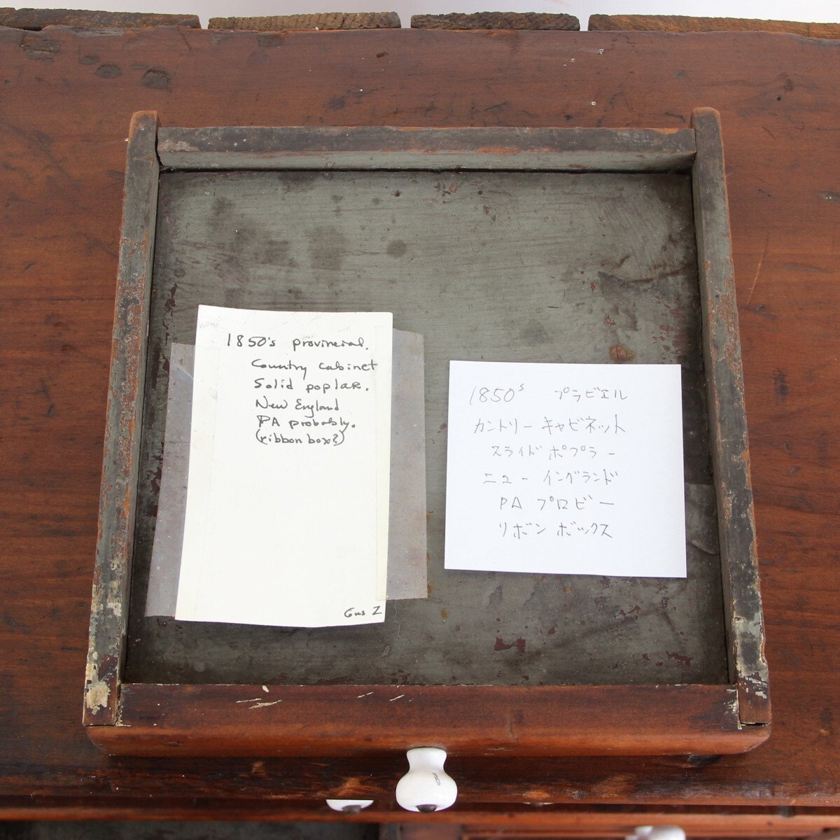 | 商品説明 explanation | 1850年代頃にアメリカニューイングランド州で使用されていた木製キャビネットです。(アメリカ現地人の説明付き) 全体のつくりも非常に古く、引出し取っ手は陶器でOLD感満載です。 アンティークの趣が魅力的で、古く希少なアイテムをいかがでしょうか。 |