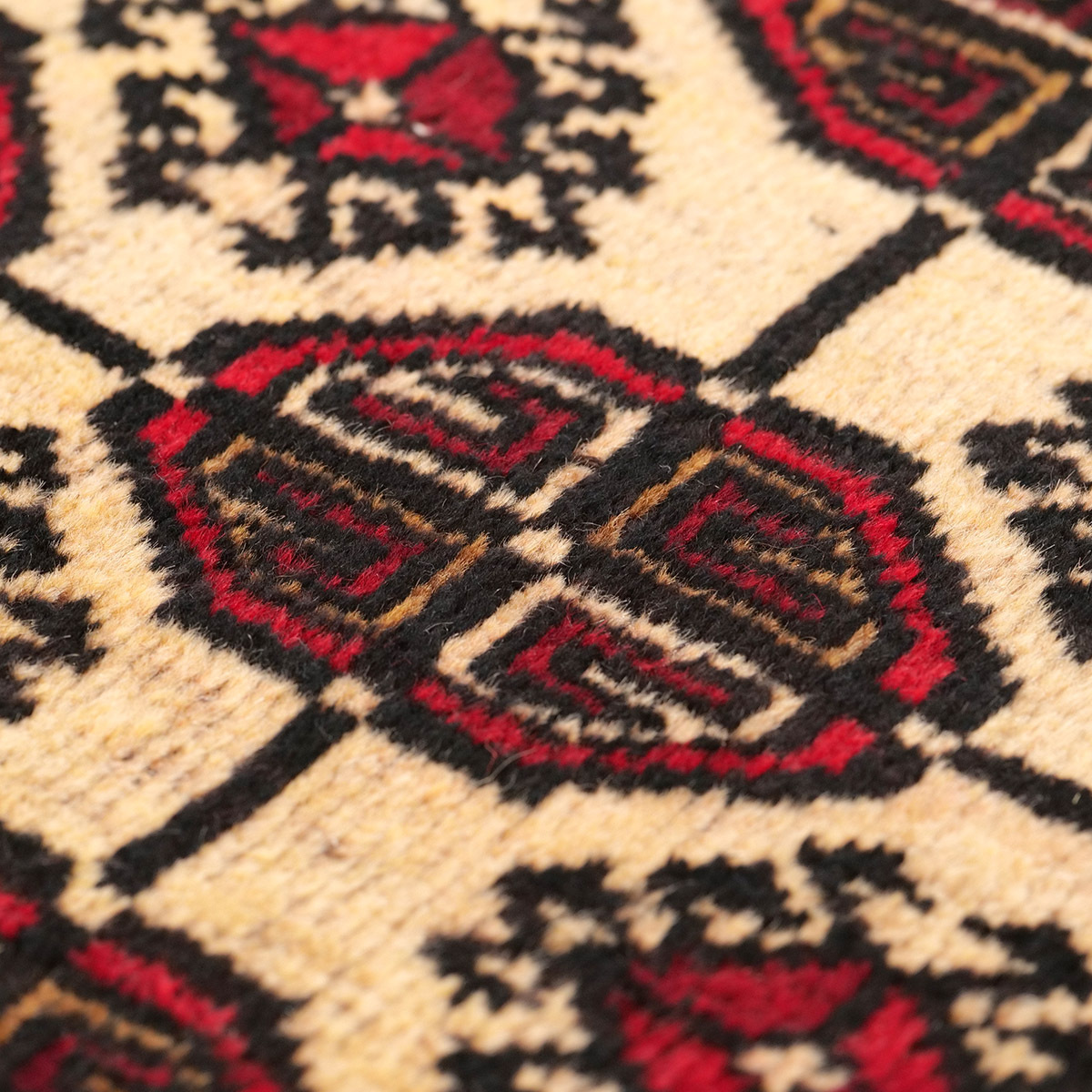 ホラーサーン州サラフスで1970年代に制作されたセミアンティークのトライバルラグです。サイズは1170×760mmで、玄関や通路、ベッドサイドなどに適した扱いやすいサイズ感です。