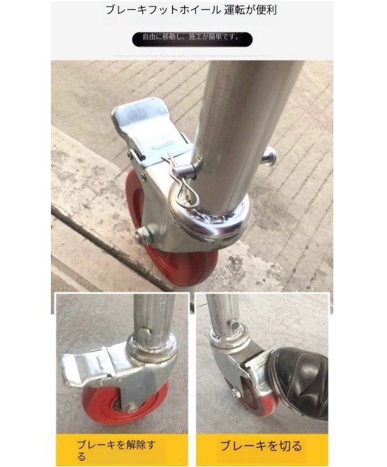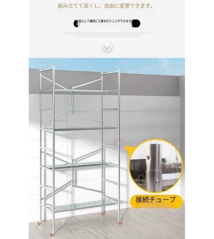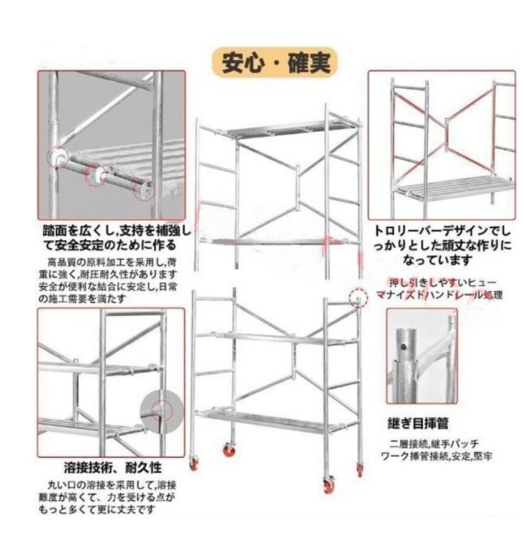 質な素材】当社の 足場 は制品は亜鉛メッキから作られており、耐久性のある溶接プロセスは、全体のラウンド溶接は、サポートを強化し、強い荷重、その最大積載量は500キロに達するので、安全性の問題を心配することなく、複数の人々が同時に作業することができます。同時に、彼は2/4箇の方形のペダルを組み合わせて、あなたを施工して更にの便利させます。| 素材 | アルミニウム |