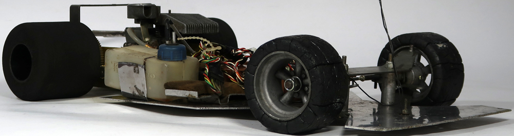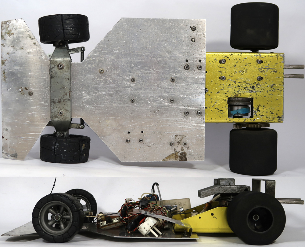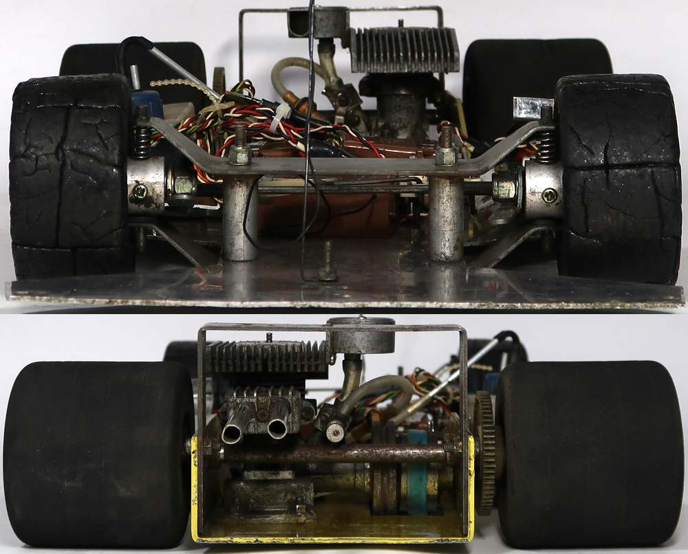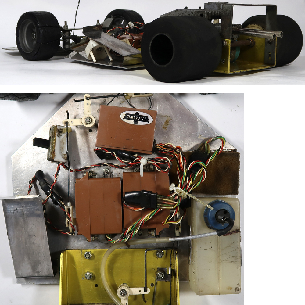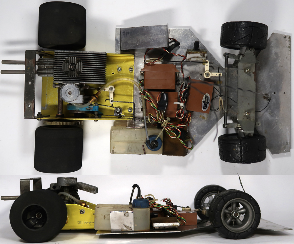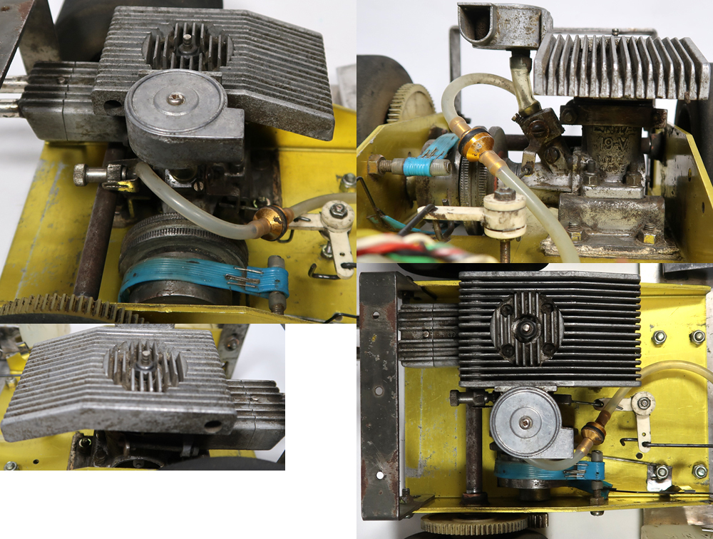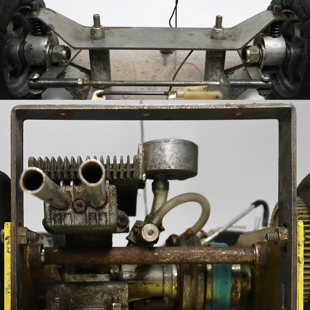 昔のものなのでよく調べたところ京商のダッシュ1なのですが、多分シャーシはトドロキ製です。エンジンはENYA 19-Vが付いています。出品は画像の本体のみです。使用品ですし古い物ですので汚れや所々に擦り傷あります。錆が有る箇所もあります。サーボ、プロポとエンジンの確認は動作させる為の機器がないので一切出来ておりません。タイヤは手で回せば回転します。スポンジタイヤは破損しております。前輪のホイールは合金製で重たいです。電池ケースのパーツが足りないです。その他に私が見る限りは特にひどいダメージは確認出来ませんでした。走行させる為にはきちんとした修理及びメンテナンスやその他に走行用の為の機器が必要です。画像をご覧になってご自分でご確認ください。分かる事は以上です。お取引後は一切のサポートはしておりませんので問題があればご自分でご対処ください。お取り引き後に説明以外の不足品や説明以外の破損や故障が有ったとしても返品は出来ませんしクレームもお受けできません