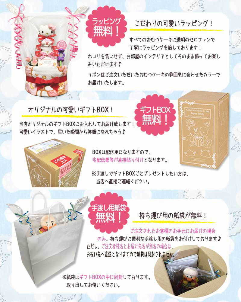 ・ラッピングに使用致しますリボンの色・お花の色・おむつケーキのデザインは弊社スタッフがコーディネートさせて頂きます。 ・商品本体の破損やご注文と異なる商品が届いた場合を除いて、お客様のご都合による商品交換、返品は衛生上お受けしておりません。 ・商品はデジカメ撮影をしておりますので、お使いのPC環境等により画像の色が実物と多少異なる場合がございますが予めご了承下さいませ。 |