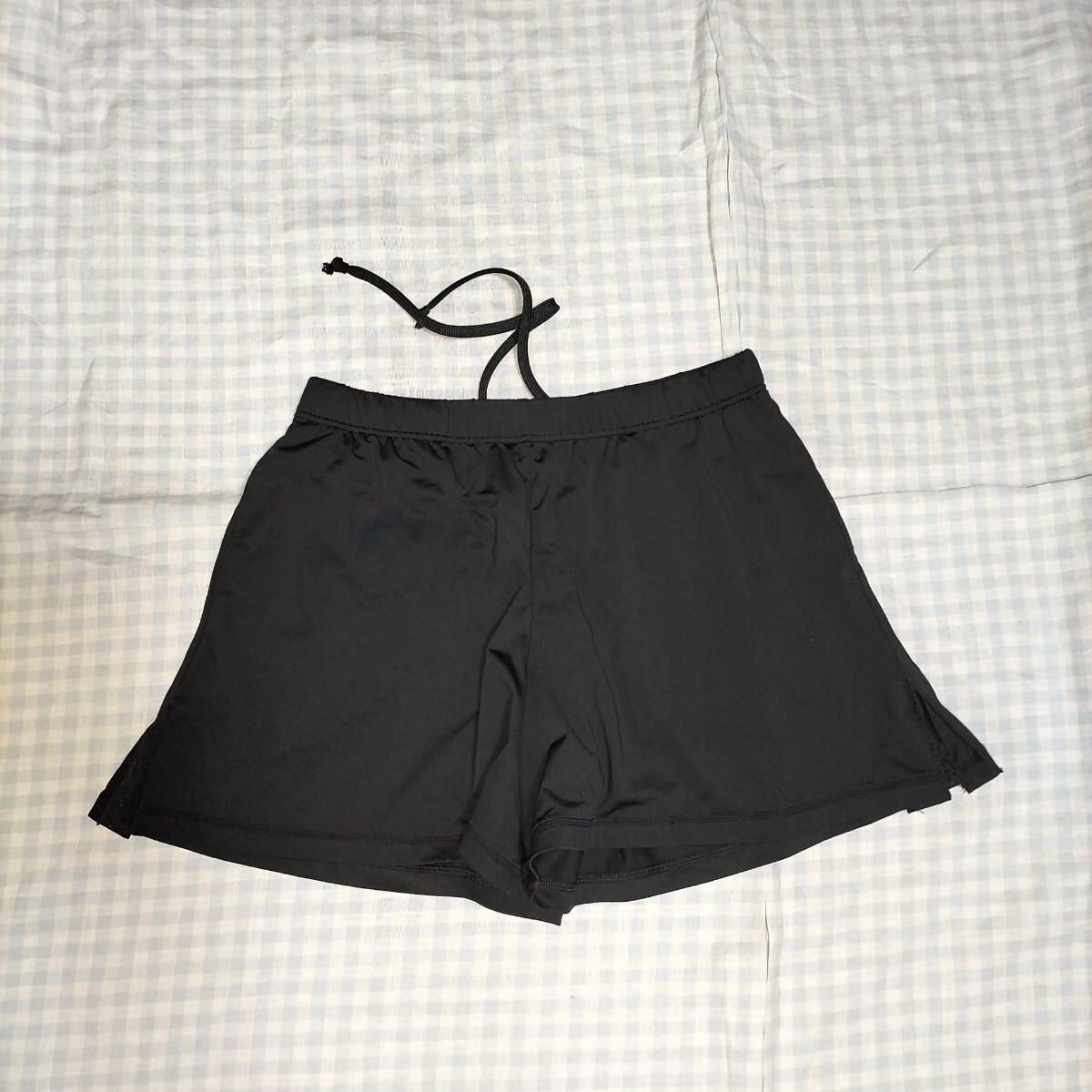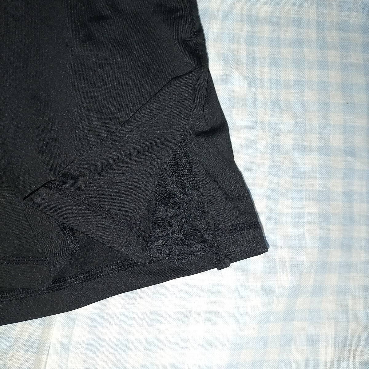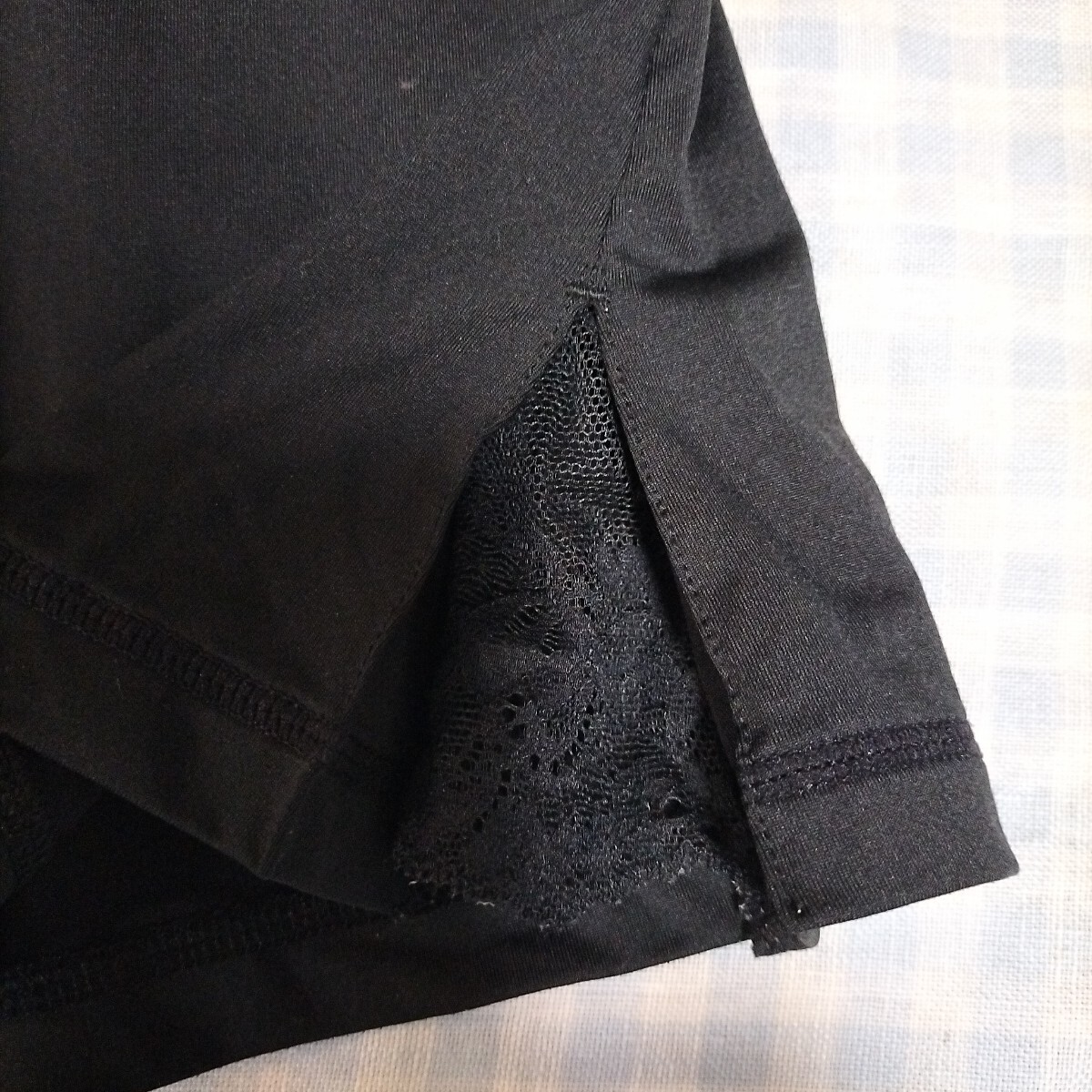 色は黒 サイズM 素材は画像をご覧ください。左右にポケットあり。後ろにチャック付きのポケットあり。スリットにレースがあり、オシャレです。実寸:ウエスト66cmゴムと紐で前後10cmは軽く調節できます。着丈33cm