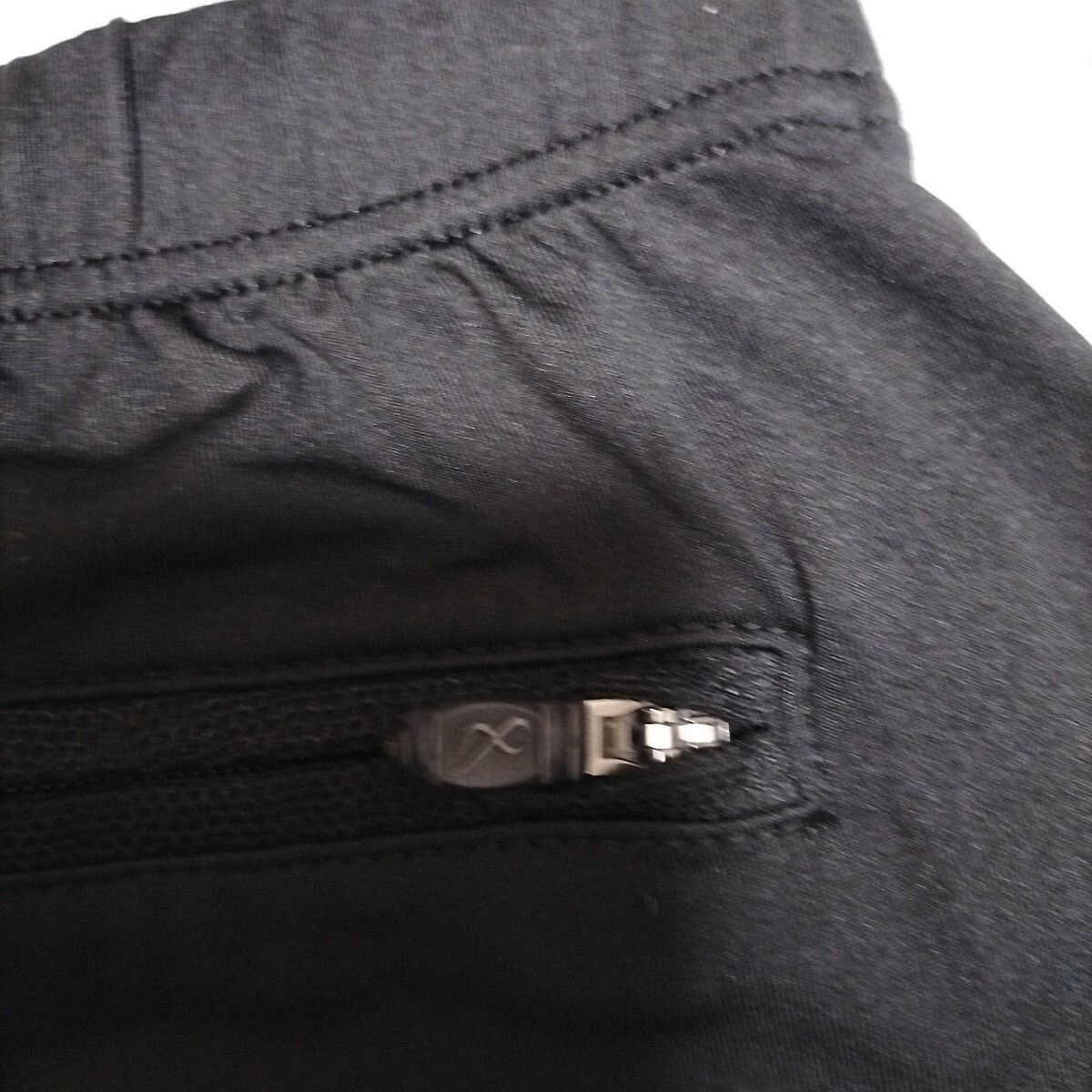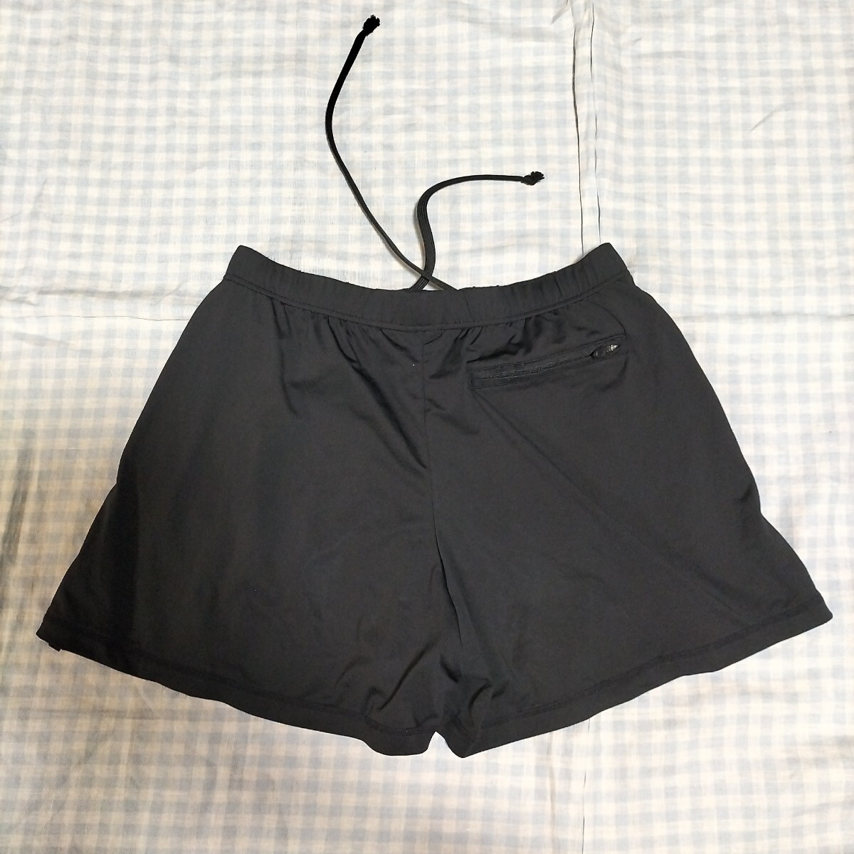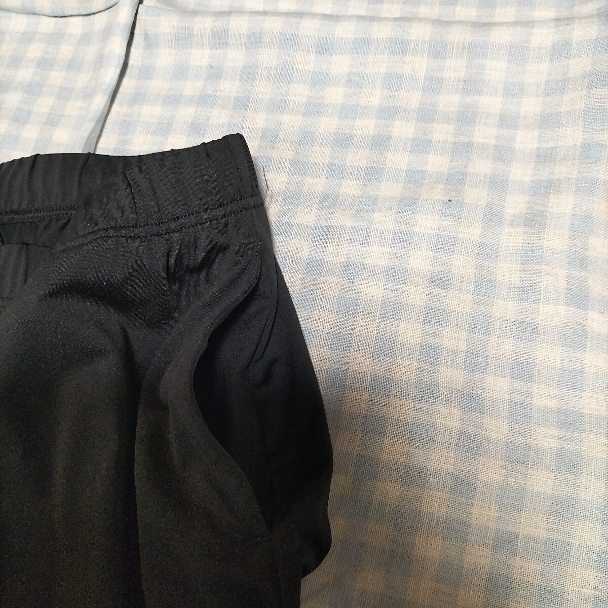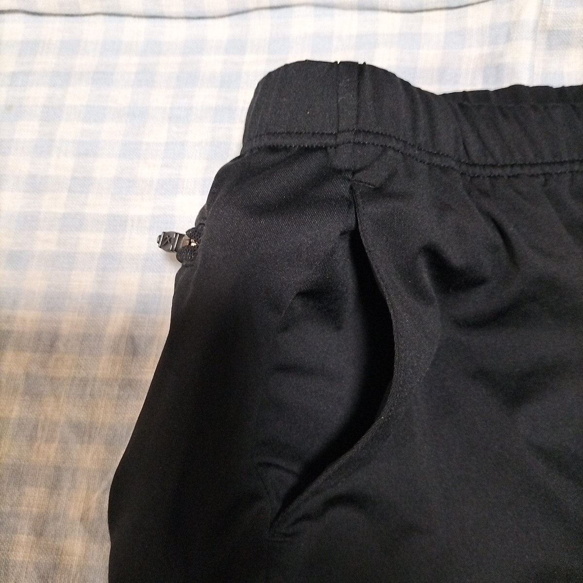 色は黒 サイズM 素材は画像をご覧ください。左右にポケットあり。後ろにチャック付きのポケットあり。スリットにレースがあり、オシャレです。実寸:ウエスト66cmゴムと紐で前後10cmは軽く調節できます。着丈33cm