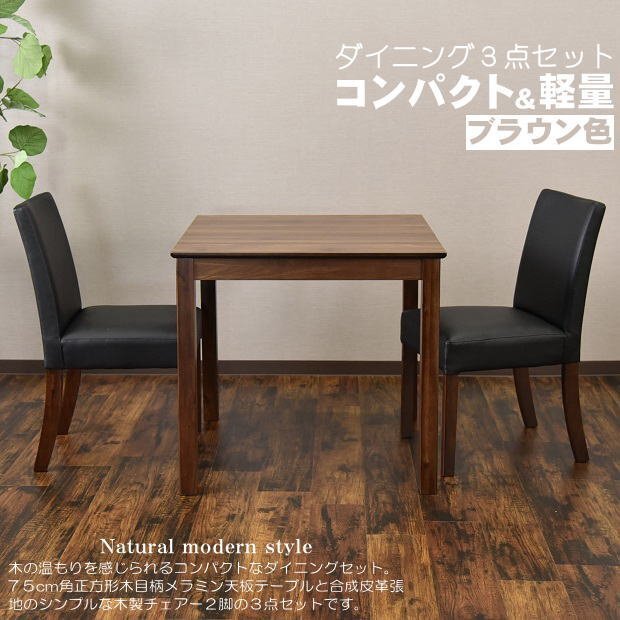 | 【商品特徴】 | ◇木の温もりを感じられるコンパクトなダイニングセット。75cm角正方形木目柄メラミン天板のテーブルと合成皮革の張地シンプルな木製チェアー2脚の3点セットです。 (チェアーについて) ・狭いスペースでもご利用できるコンパクトサイズで、移動や持ち運びがしやすい軽量タイプです。 ・シンプルなデザインでデスクチェアーや待合の椅子等としてもご利用が可能です。 ・脚部には、天然木のラバーウッド無垢材を使用しています。木の温もりを感じられるナチュラル感あるシンプルな脚部です。 ・張地は、汚れをサッと拭くことができ、お手入れが簡単なブラック色の合成皮革(PVCレザー)を使用しています。 ・ウレタンと合板で構成された中材の座面。しっかり硬めの座り心地です。 ・緩やかに湾曲した背もたれ。フィット感のあるミドルバックタイプです。 ・表面と同じ合成皮革の張地を使用した共張仕上げの背面。すっきりとしたバックスタイルです。 ・開梱後、すぐにご利用いただける組立不要の完成品です。 (テーブルについて) ・天板表面材に、擦り傷や熱に強く飲み物を零してもサッと拭くことができてお手入れが簡単なメラミン化粧板を使用。木目が浮き出た天然木の風合いを感じられるエンボス加工の木目柄でナチュラル感があります。 ・天板木口は、表面と同系色の塗装仕上げ。船底型になって、角を少なくしています。 ・天然木アカシア無垢材を使用した脚で、木の温もりを感じられます。安定感のある4本脚タイプです。 ・脚底には、高さ調節をできるアジャスターが付いています。ネジ式で、凹凸のある床でも簡単に天板の水平を保つことができます。) ) ・表面材と同じ木目柄メラミンを、天板裏面にも貼っています。天板の反りを防ぎ、見た目にも綺麗です。 ・お客様で、脚のお取り付けが必要となっております。脚1本につき、ネジ2本でお取り付け下さい。説明書・工具の六角レンチを付属しています。 |