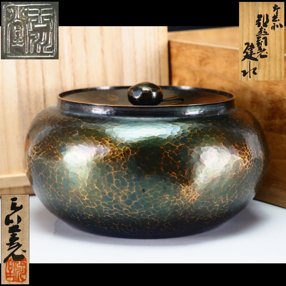 | 《サイズ》 大きさは 幅 16.8cm ・ 高さ 9.5cm ・ 重さ 519g 【※計測サイズは最大径で計測しております(例;茶釜であれば、幅は鐶付の先から鐶付の先まで、高さは底面から摘みの先までとなります】 | |||